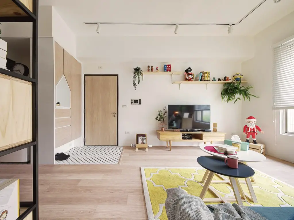petite maison simple et colorée porte d'entrée en bois salon différence espace marqué au sol mobilier bois clair espace lumineux
