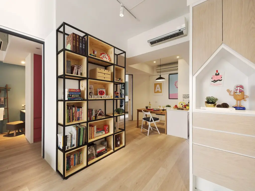 Il y a un second meuble en face de la porte d'entrée: une bibliothèque en métal et en bois avec des niches. Le meuble est plus imposant. Il ne crée pas pour autant un effet "massif" dans l'espace de passage grâce à l'alternance niches / vides et la structure en métal robuste mais discrète. Ces deux meubles offrent à l'entrée / séjour suffisamment de rangements pour que l'espace ne semble pas surchargée.