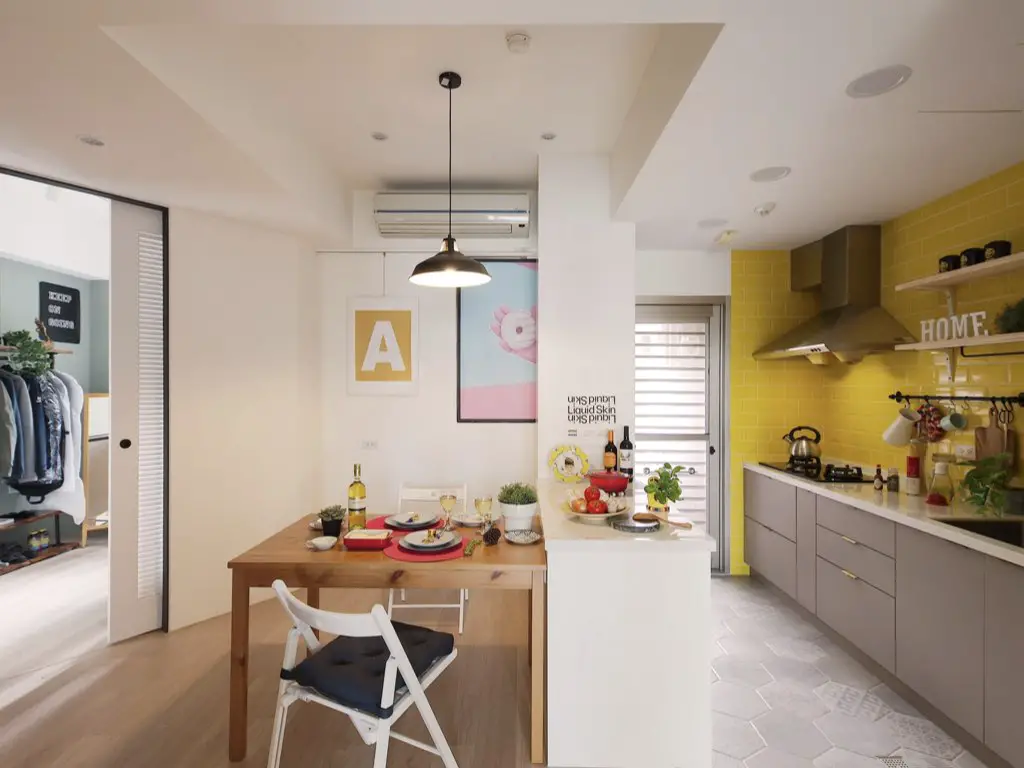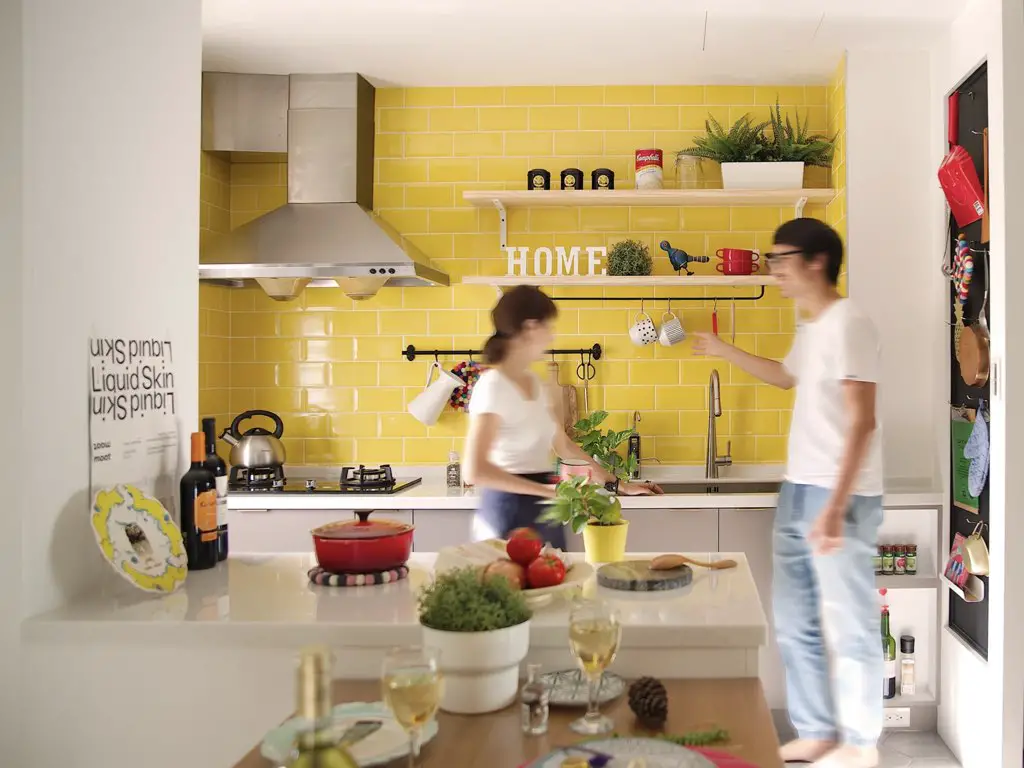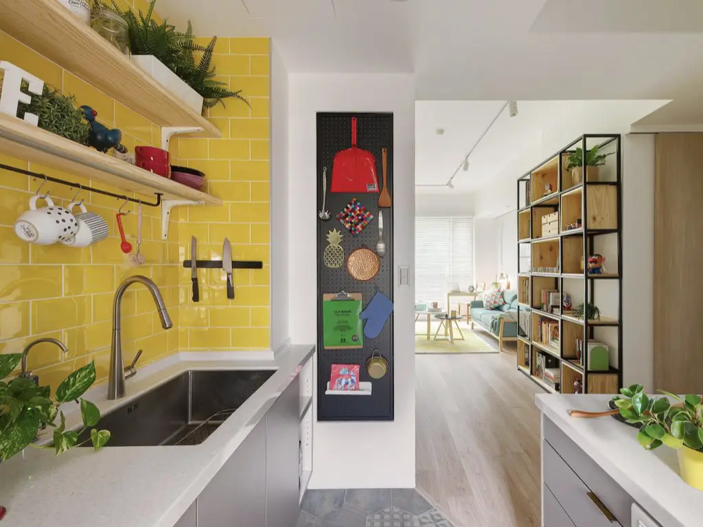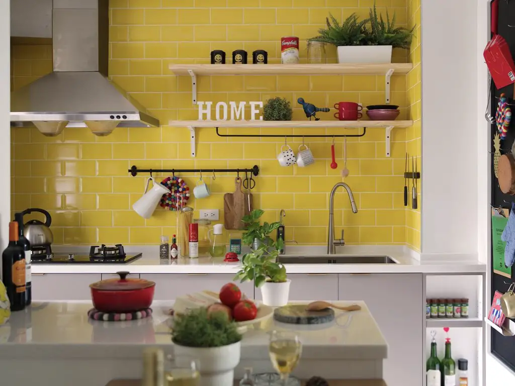 petite maison simple et colorée cuisine moderne ouverte crédence murale carrelage métro jaune