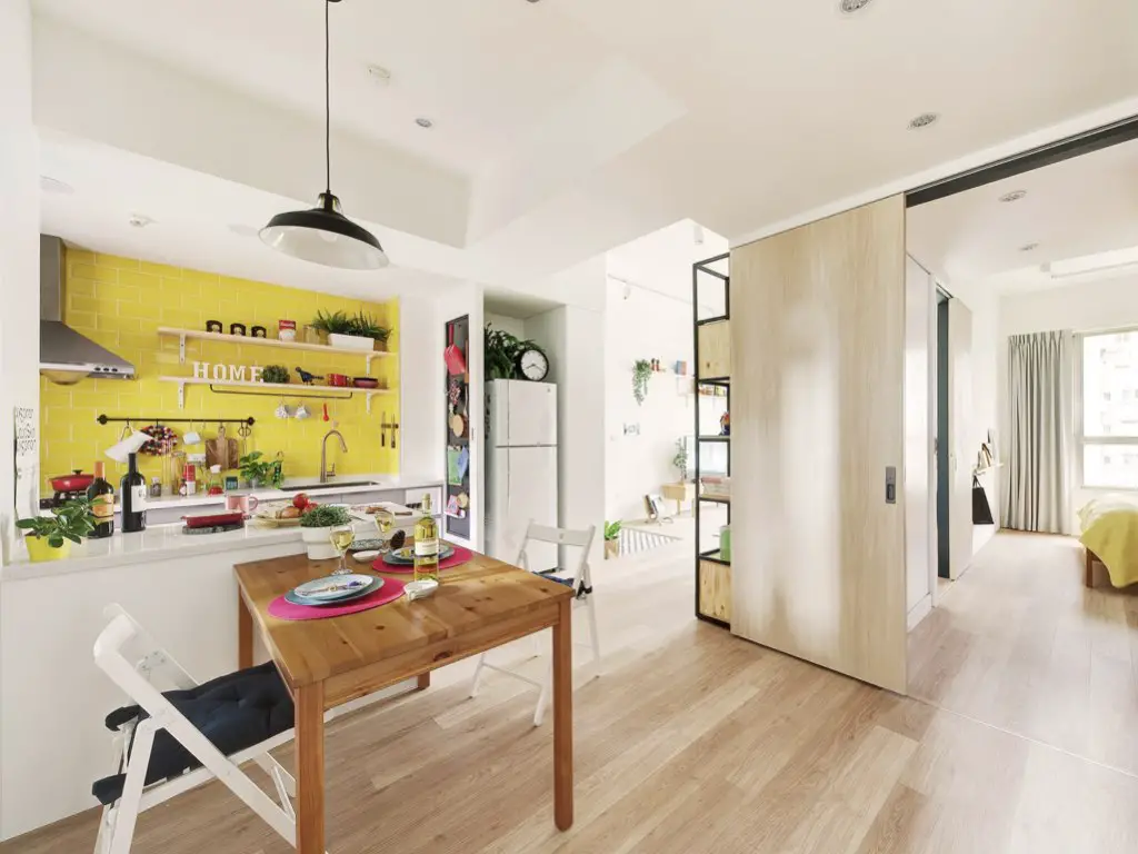 petite maison simple et colorée coin repas table en bois 2 personne accolée à la cuisine espace lumineux