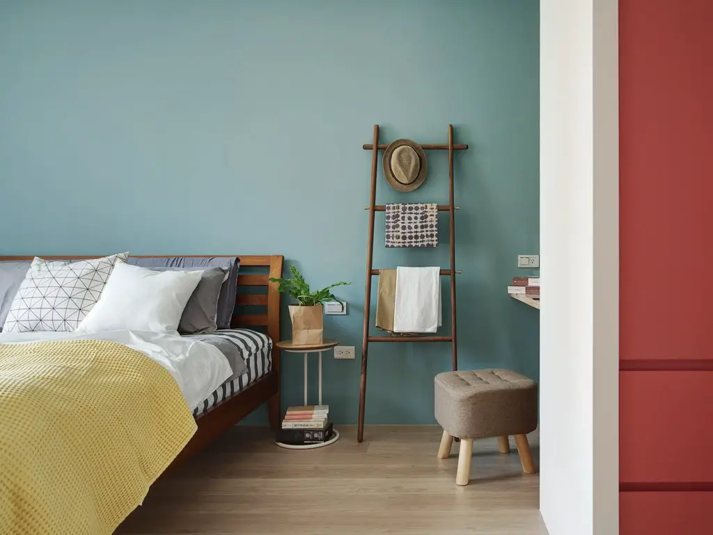 petite maison simple et colorée chambre adulte moderne mur bleu placard rouge couvre-lit jaune meuble en bois sombre
