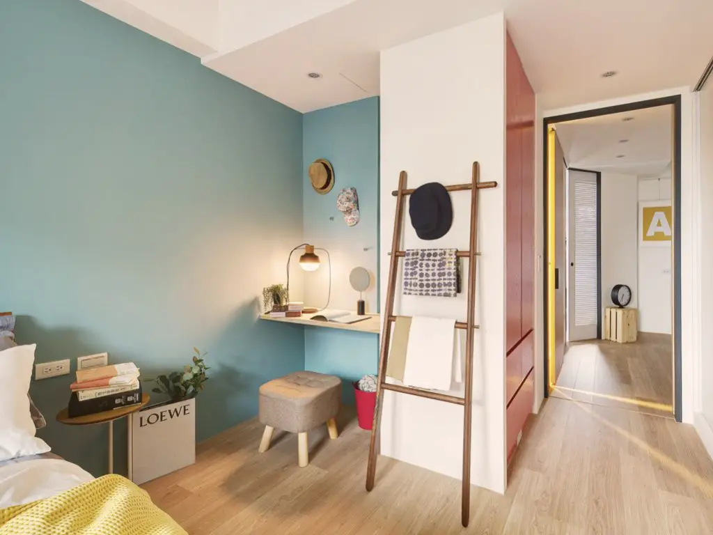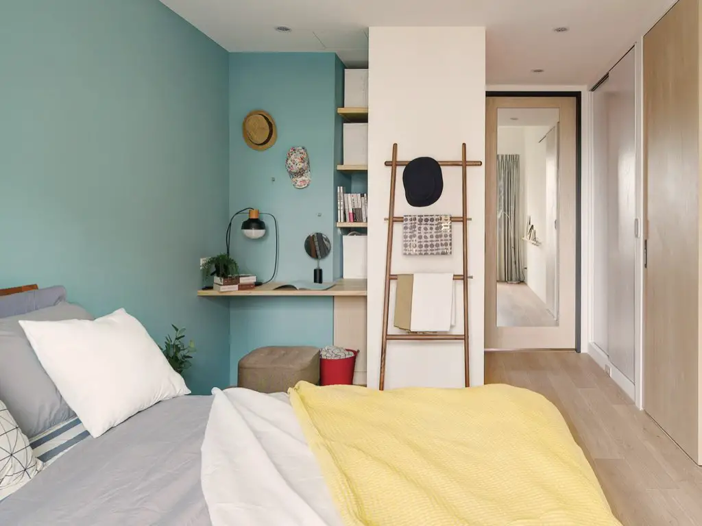 Toujours dans l'idée de rangement, partons vers la chambre pour cette 3ème solution gain de place. Ce logement a deux chambres, l'une sert de rangement / chambre d'amis. La chambre principale quant à elle est plus minimale. Il y a tout de même un placard de rangement qui permet deux choses: D'abord, créer un petit couloir et séparer l'espace sommeil de la porte de la chambre. Et deuxième avantage, ce placard crée un petit renfoncement suffisant pour installer une coiffeuse. Cette dernière n'est pas tout à fait dans l'espace sommeil. Elle est passe presque inaperçue.