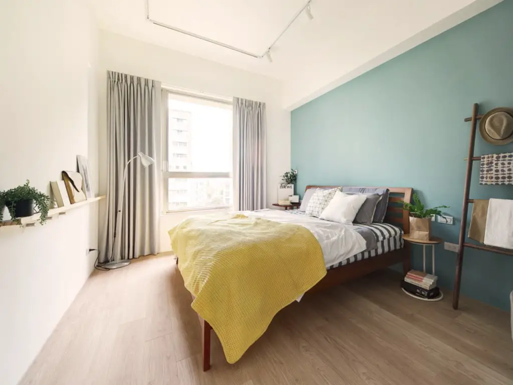 petite maison simple et colorée chambre moderne petite étagère mur accent bleu grande fenêtre avec rideaux gris perle