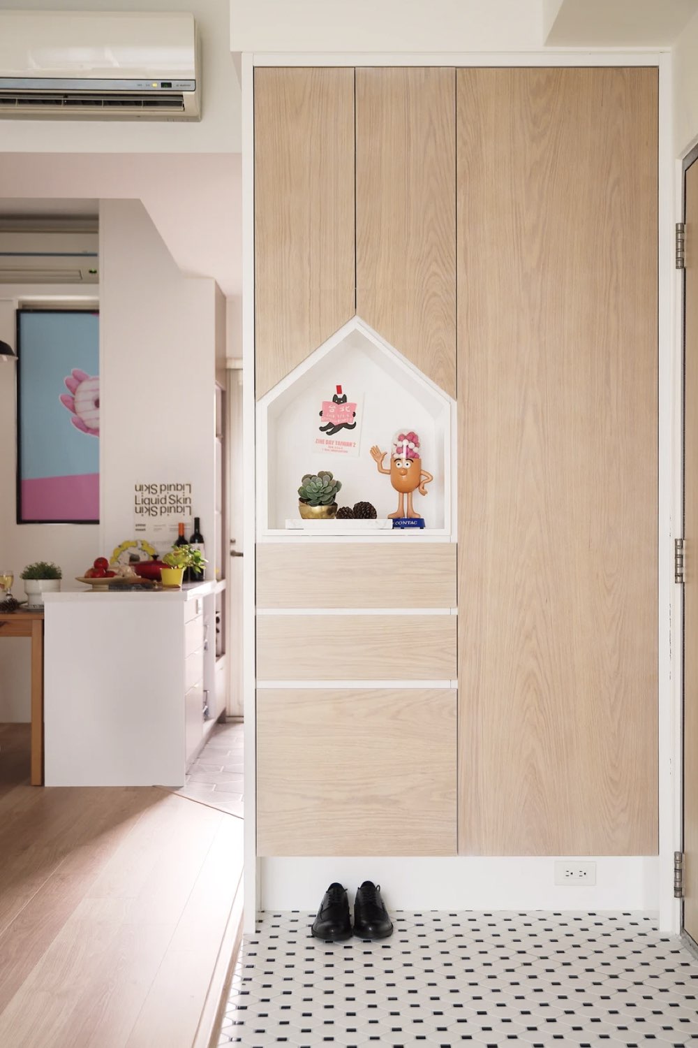 Dans un petit logement, pour éviter le sentiment de manquer de place, les rangements sont importants. Ils doivent être suffisamment nombreux pour répondre à vos besoins. Ici, c'est l'espace entrée qui permet de créer des espaces de rangements. L'entrée est ouverte sur le salon (et délimitée visuellement avec un tapis de carrelage). La seule cloison de l'espace est un meuble sur mesure avec un placard, des tiroirs et une niches. Ce meuble permet de ranger sans montrer - pratique pour les affaires peu esthétiques.