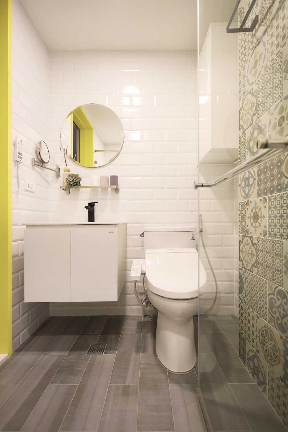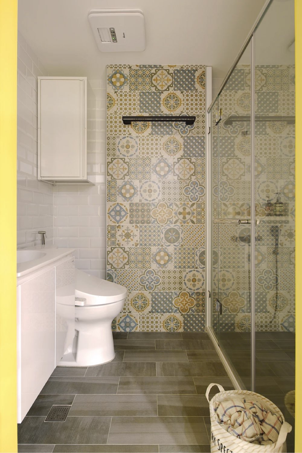 • l'encadrement de porte de la salle de bain a été peint en jaune néon;