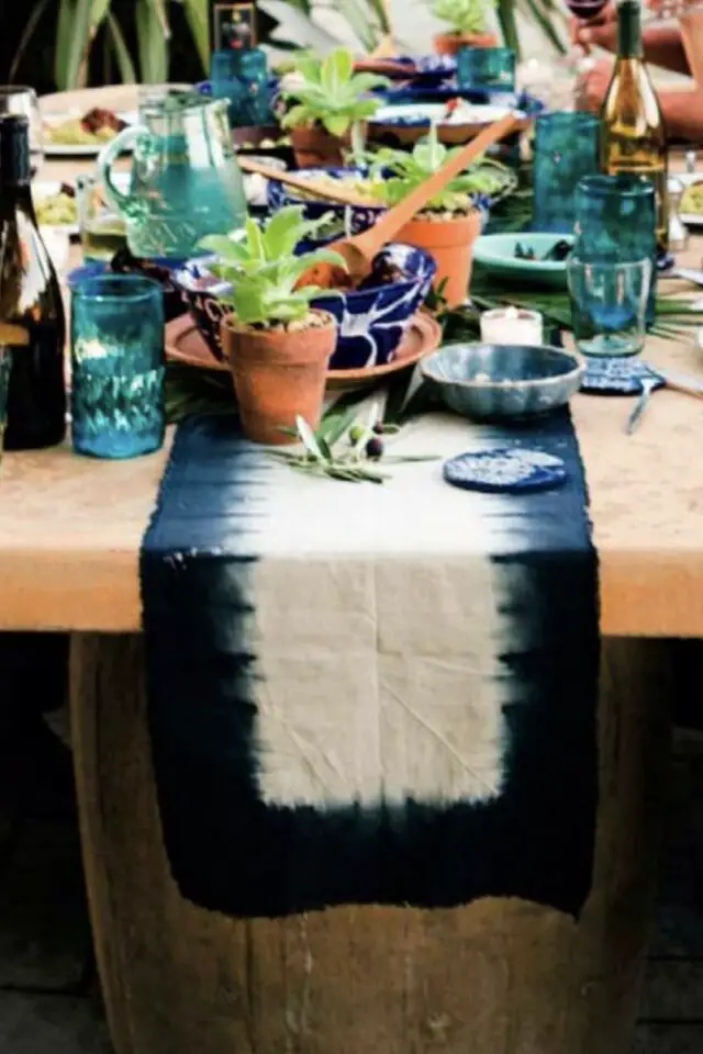 Dernière inspiration, le retour du tie and dye. J'aime cette technique surtout dans des tonalités de bleus. Cela me rappelle la mer, les vacances, l'été... Si j'ai sélectionné cette dernière idée à copier c'est surtout pour vous montrer l'association d'un chemin de table et d'un centre table.