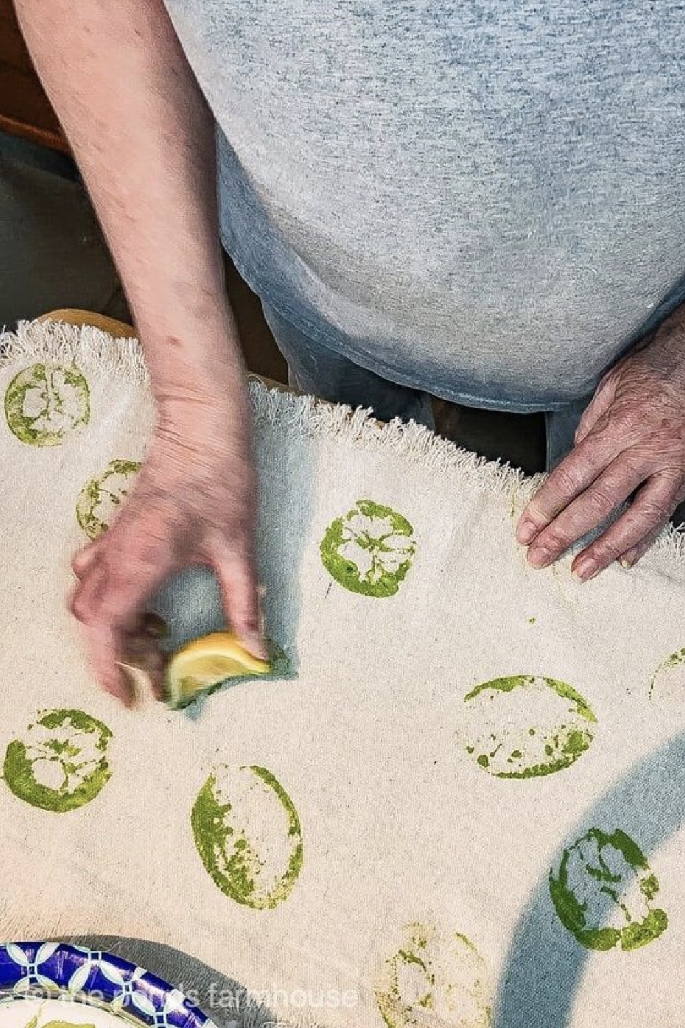 Dans cet article vous aurez plusieurs exemples de créations avec des fruits. Là, c'est le citron qui sert de tampon et qui offre un côté graphique déstructuré au chemin de table.