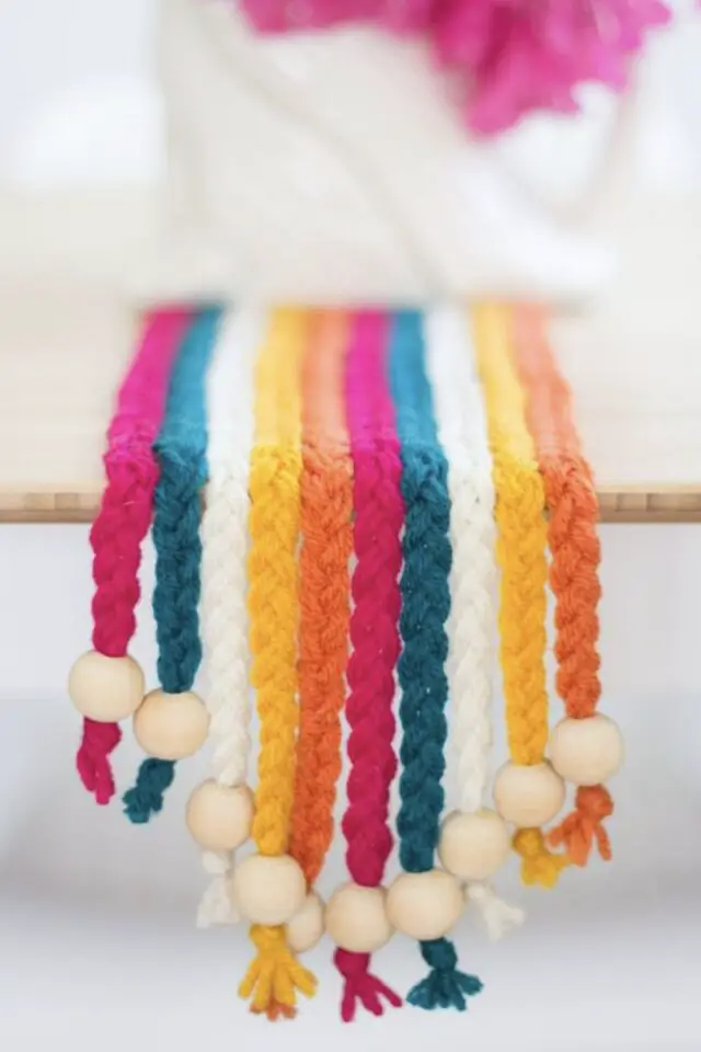 J'aime bien la finition avec des perles en bois. En revanche ce que l'image ne montre pas c'est qu'il est préférable de coudre les tresses entre elles pour éviter que l'ensemble ne bouge si on pose un vase par exemple dessus. La couture peut facilement être réalisée à la main à intervalles réguliers.