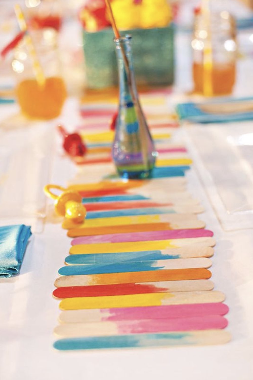 De la peinture, un crayon de papier avec une gomme au bout et un chemin de table blanc (en tissu ou en papier). C'est tout ce qu'il faut pour réaliser ce petit bricolage coloré.