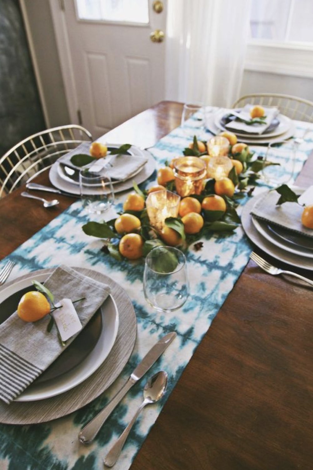 Ce dernier est lui aussi facile à confectionner: de petits photophores et des agrumes avec leur feuillage. Simple et naturel!