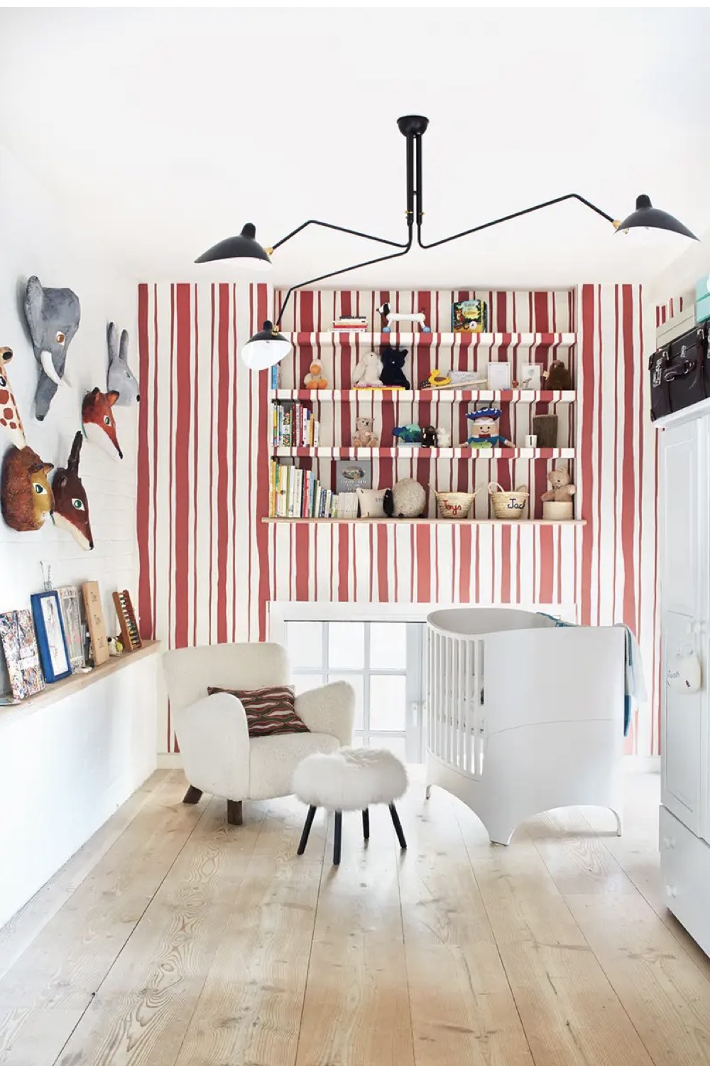 Des touches de couleurs intenses sont présentes mais sans être criarde: le papier peint à rayures rouges dans la chambre de bébé, des coussins en velours vert, la table basse bleue, une tête de lit rayée bleue...