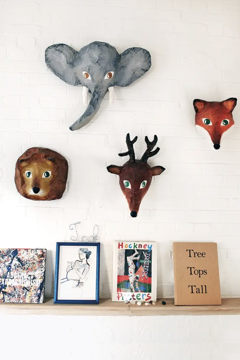 On peut prendre l'exemple de la déco murale dans la chambre d'enfant. Il y a sur un mur des trophées regroupés, en dessous une étagère bibliothèque. Sur un autre mur, on trouve des étagères avec des objets déco. Cela donne une certaine organisation dans la déco murale.
