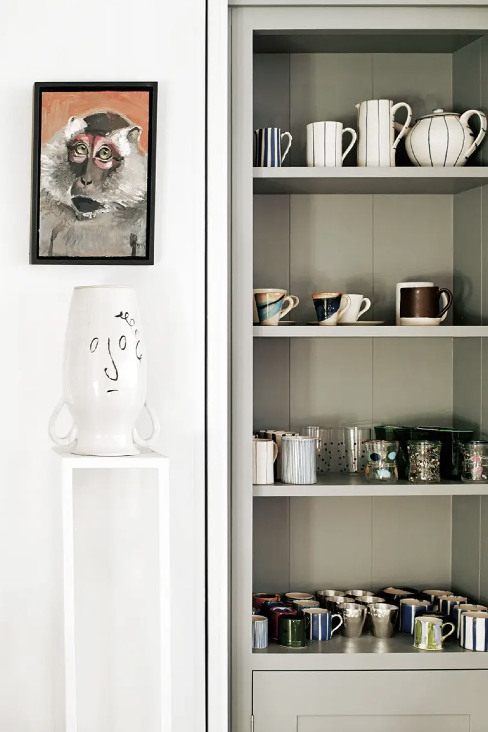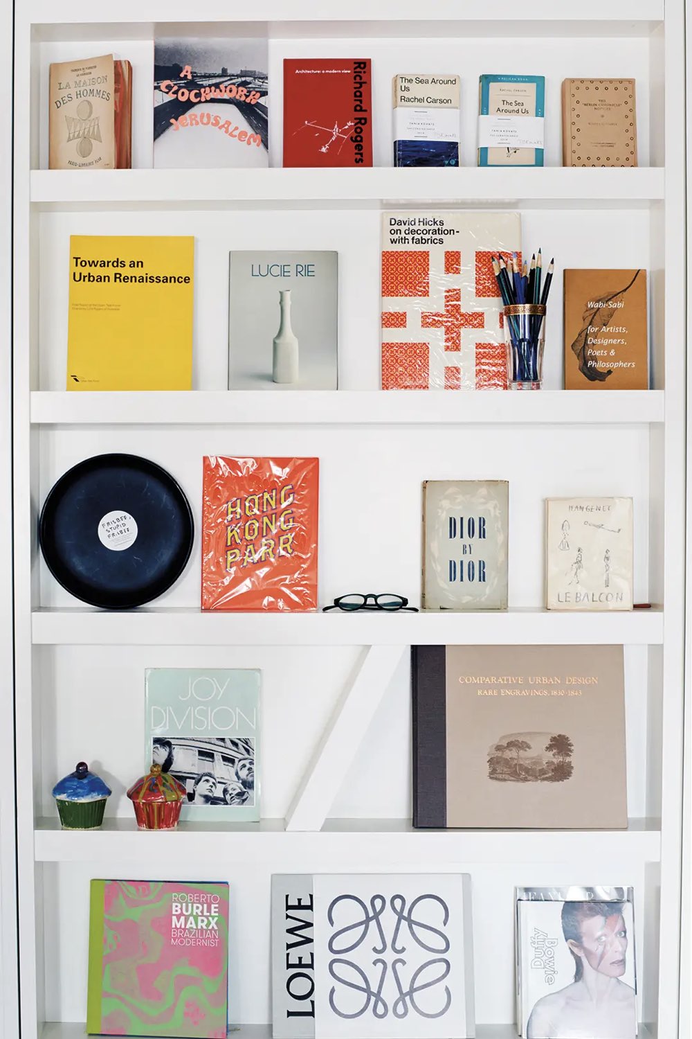 Les livres font partie des objets collectionnés de cet intérieur. Ils sont mis en valeurs sur des étagères murales. Cependant, ici, il n'est pas question de créer un rayonnage comme on en verrait dans une bibliothèque. La taille, l'épaisseur, l'apparence de chaque livre est mis en valeur. Il est question de jouer avec eux pour créer un ensemble esthétique. Les étagères deviennent de mini-galeries qui exposent livres et objets d'art.