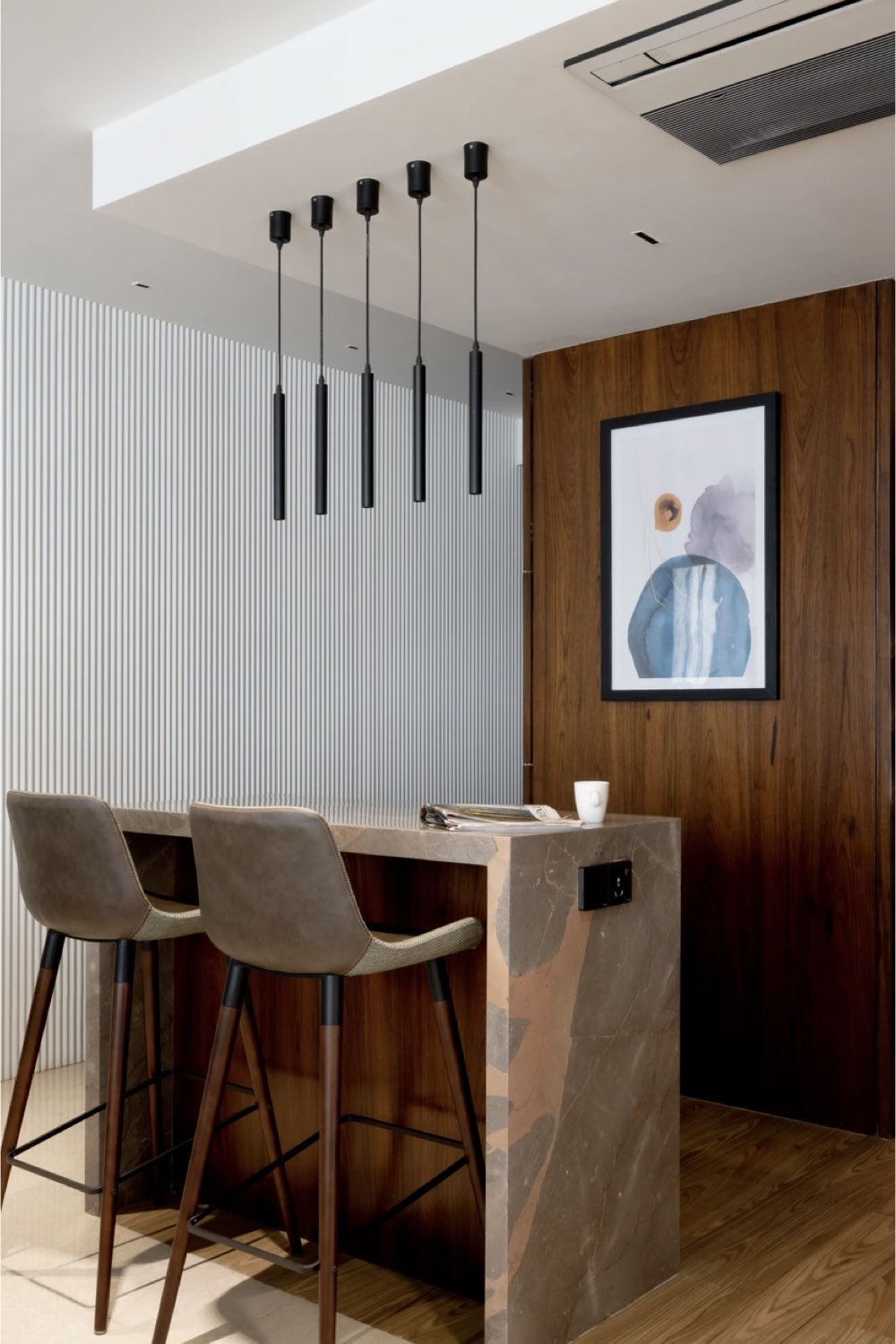 Il y a une harmonie dans le choix des matériaux aussi. Le mur TV est en marbre, il reprend le marbre du comptoir avant la cuisine. Le bois est plus localisé du côté de la salle à manger avec un pan de mur couvert de bois mais aussi le buffet qui est posé au dos du canapé. Choisir le bois dans la salle à manger lui offre un côté plus chaleureux.