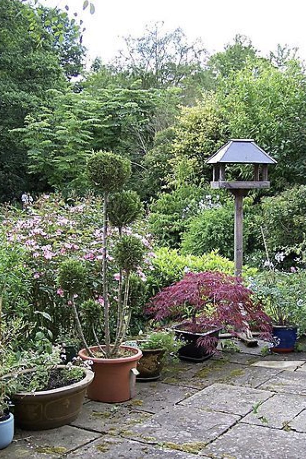 - une statuette placée entre deux pots de fleurs,