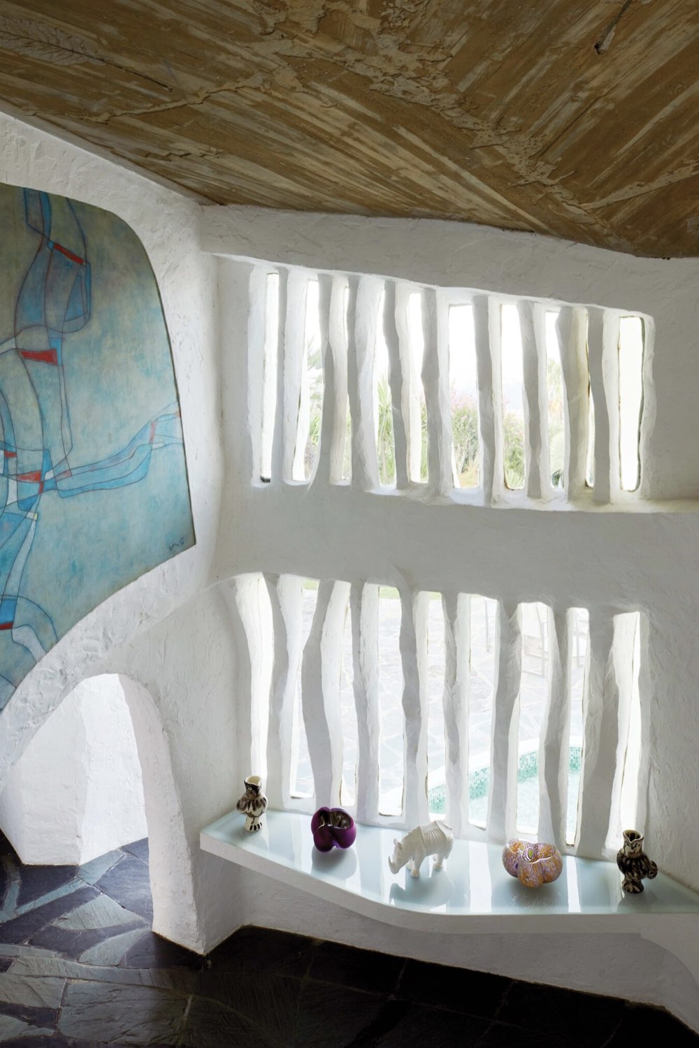 - Couëlle a une vision organique de l'habitat. Cette maison par exemple est construite comme l'intérieur d'un escargot. Les fenêtres sont protégées par des stalactites en béton.