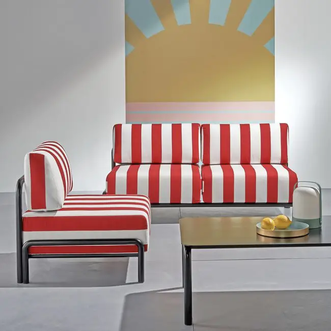 mobilier exterieur la redoute jardin canapé coussin à rayures rouge et blanc tendance French Riviera