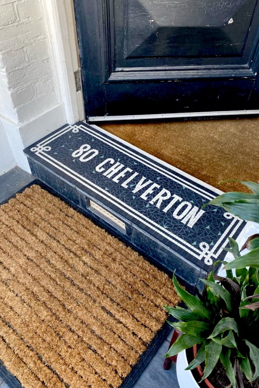 Il y a une réalisation que j’aime par-dessus tout sur ton site, c’est le tapis d’entrée (celui de Londres). J’aime son design suranné qui apporte beaucoup de charme avant même d’entrer dans la maison. Peux-tu nous en dire plus sur ce type de création?