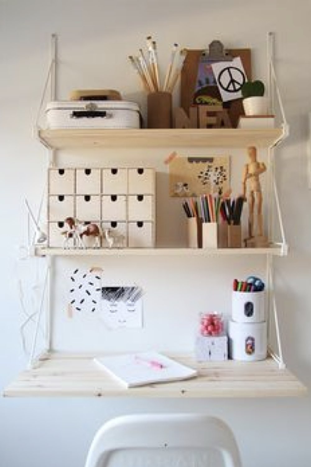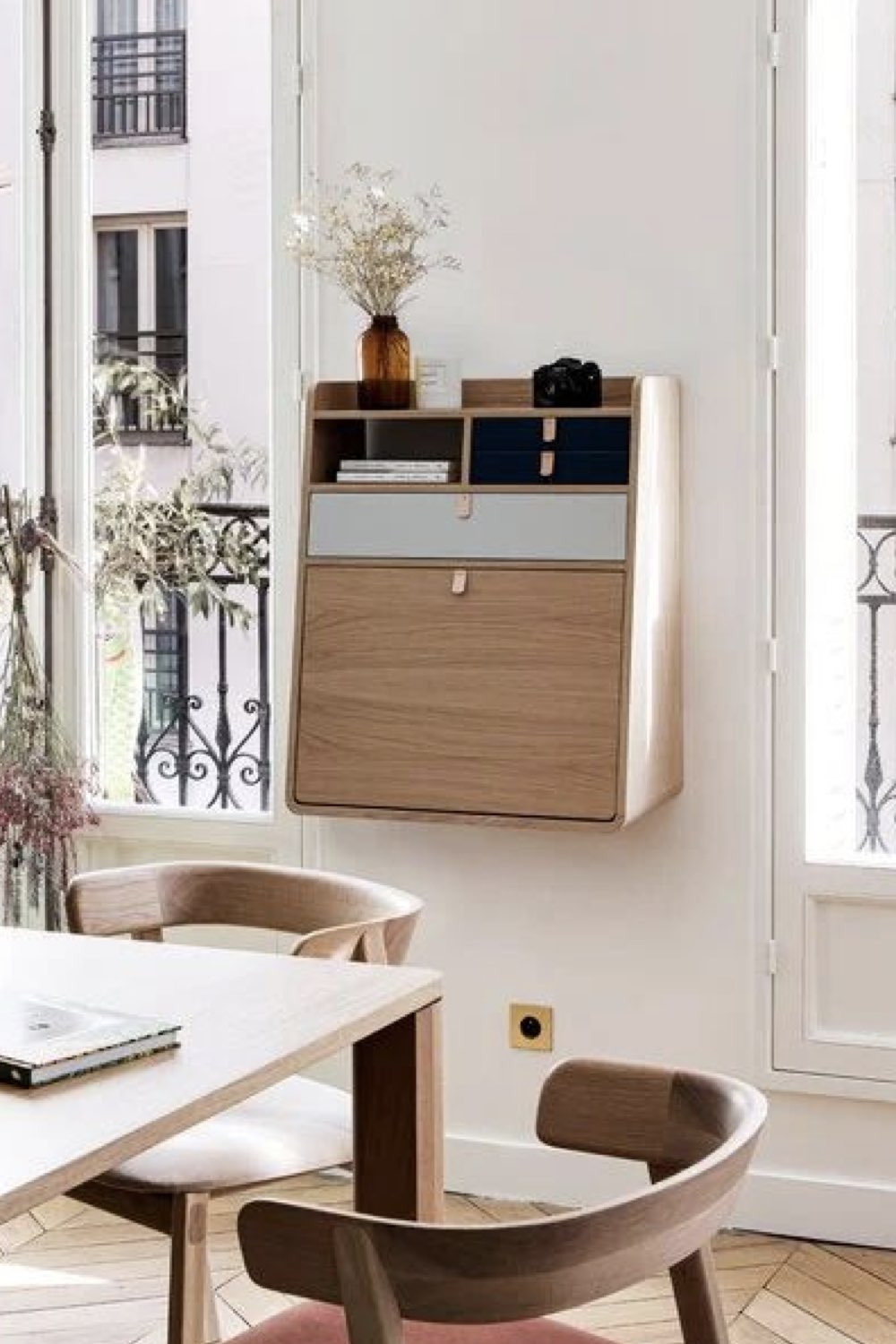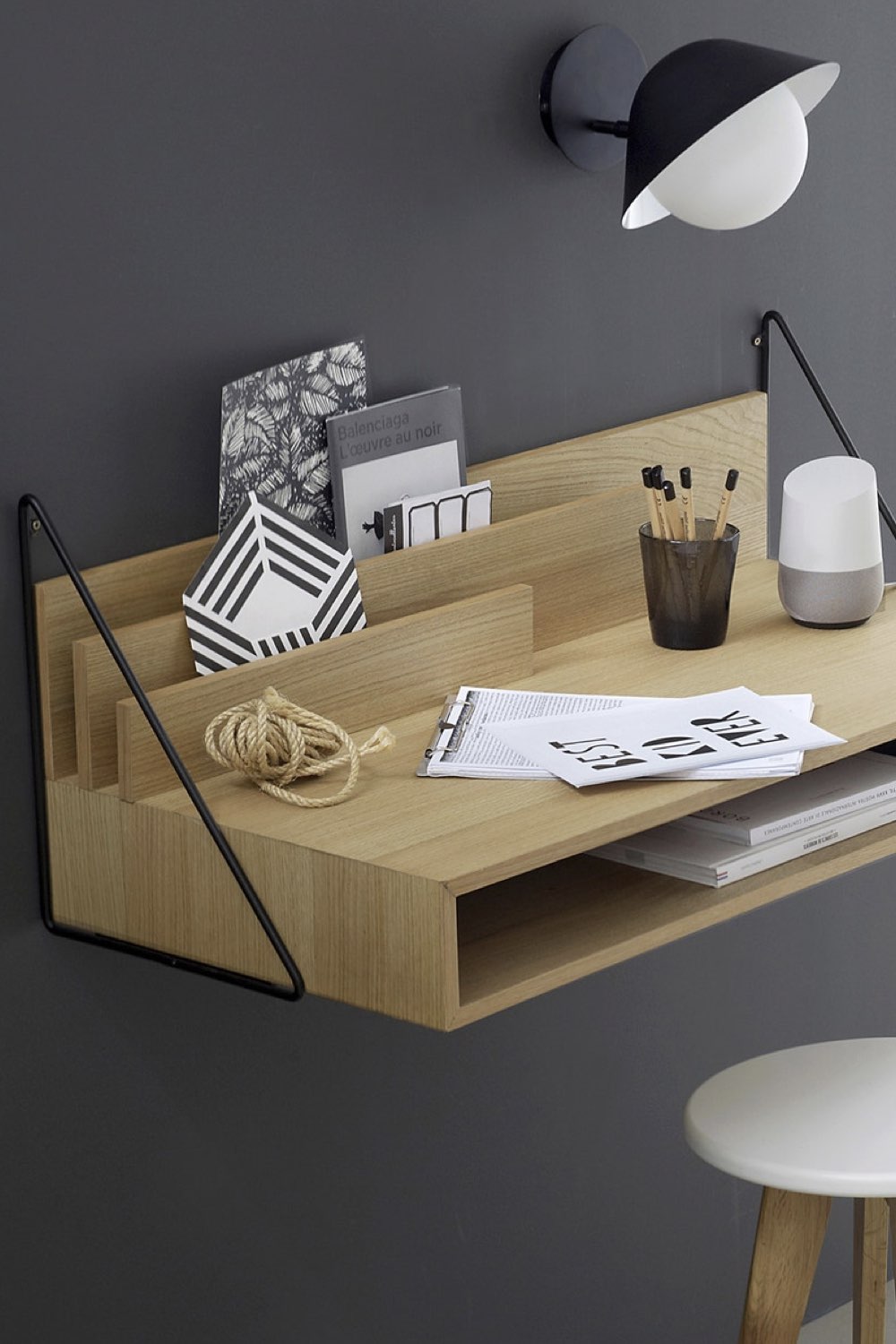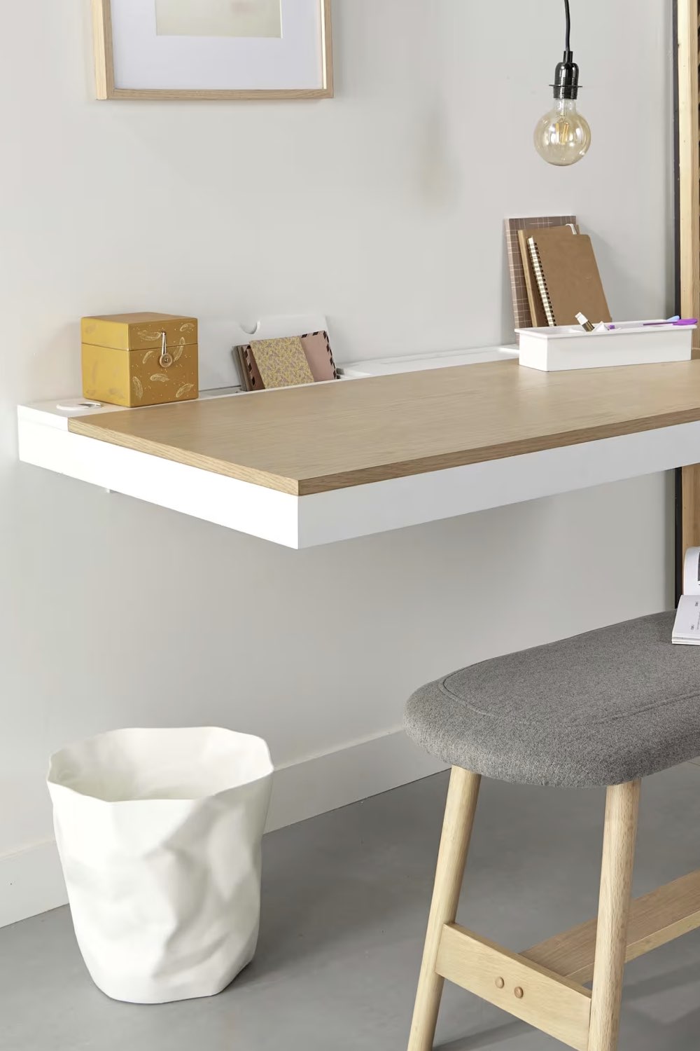 J'aime les petits espaces, j'aime surtout les solutions pour les aménager. Même si le bureau mural convient aussi bien aux petites pièces qu'aux grandes, je vous invite à envisager cette solution si vous avez envie d'un coin bureau chez vous. Dans le salon, dans l'entrée ou encore dans la chambre, son faible encombrement fait qu'il trouve sa place facilement dans une pièce existante.