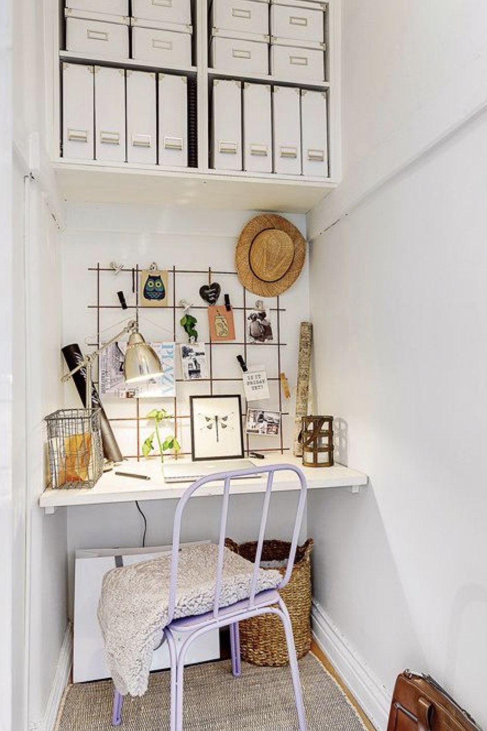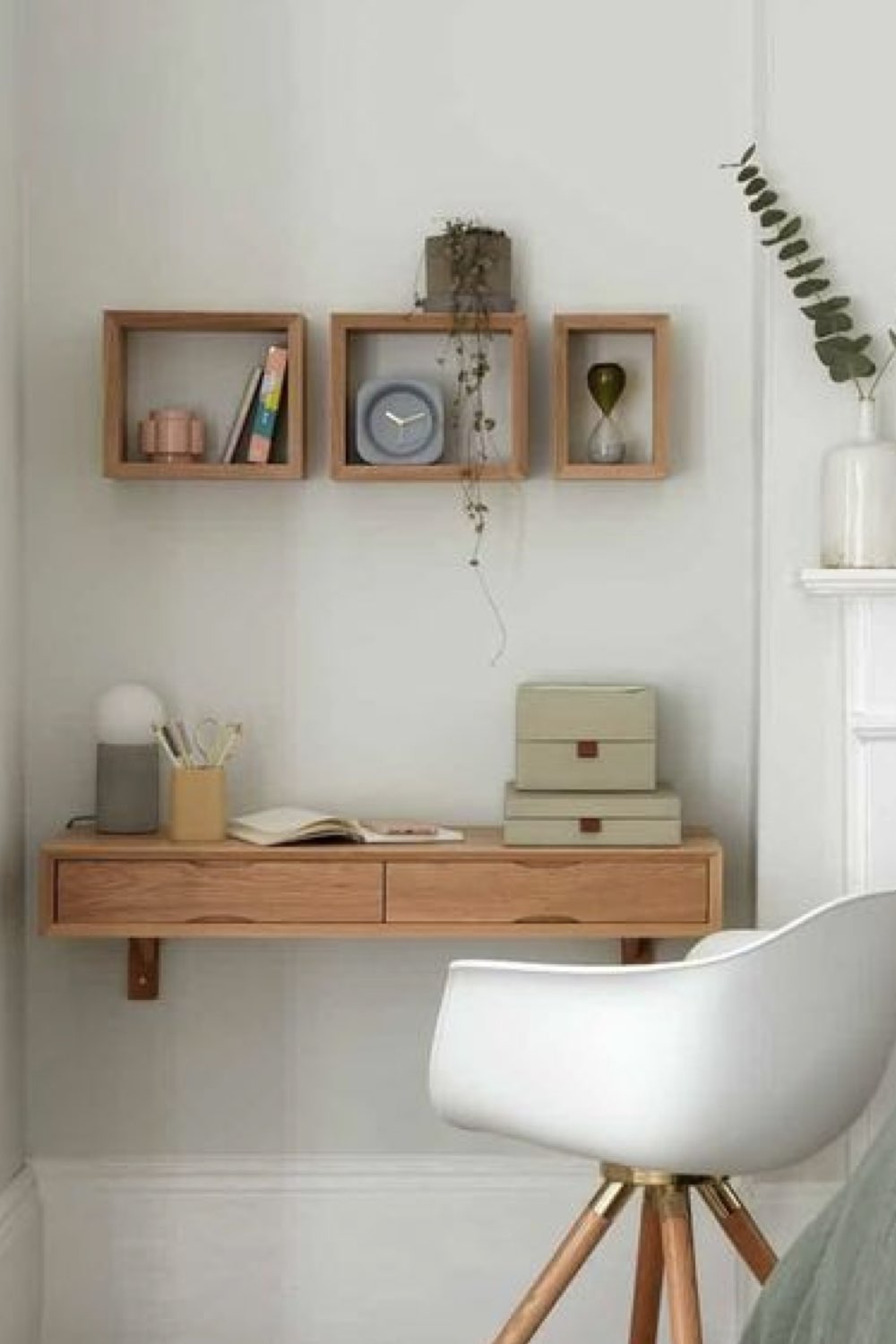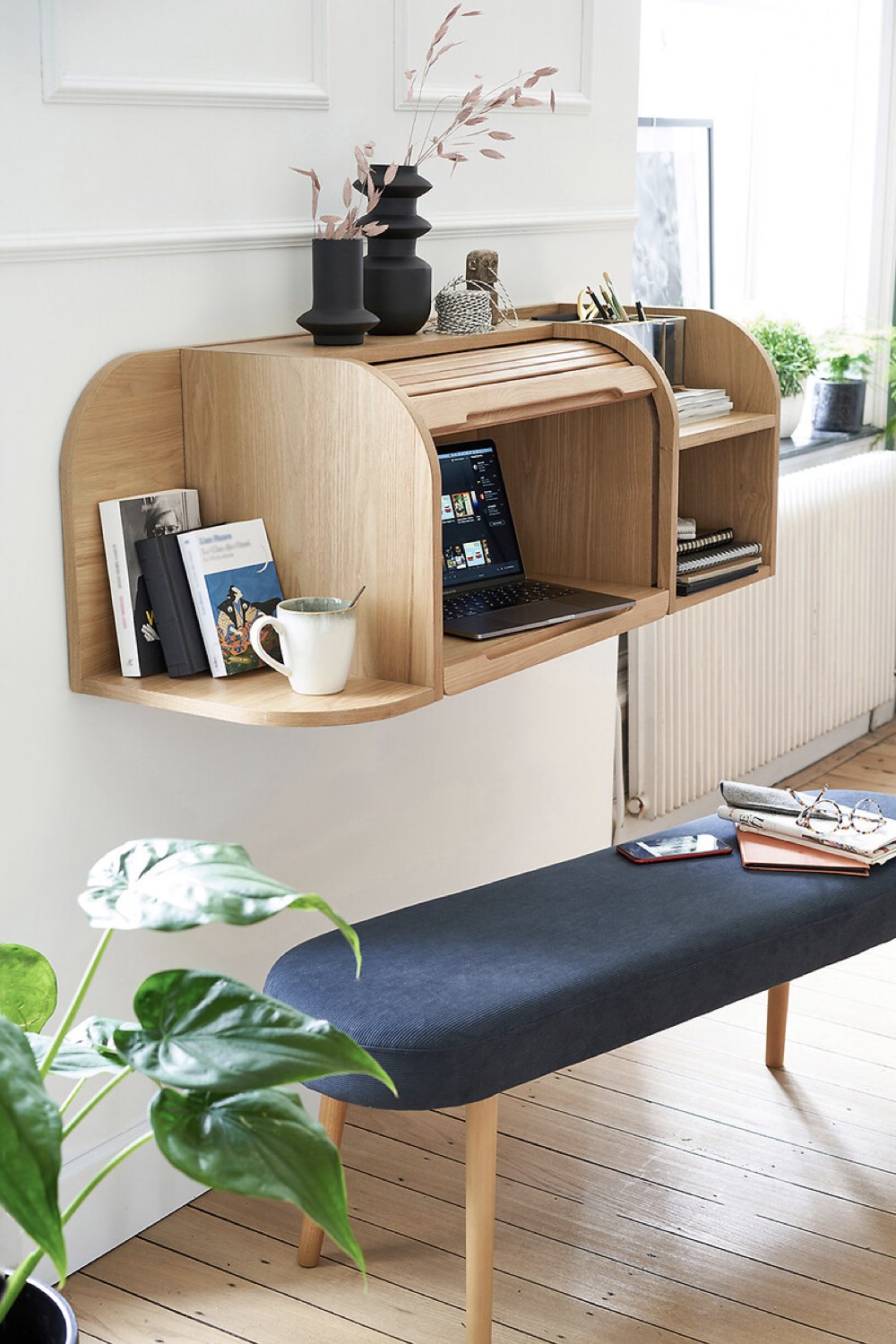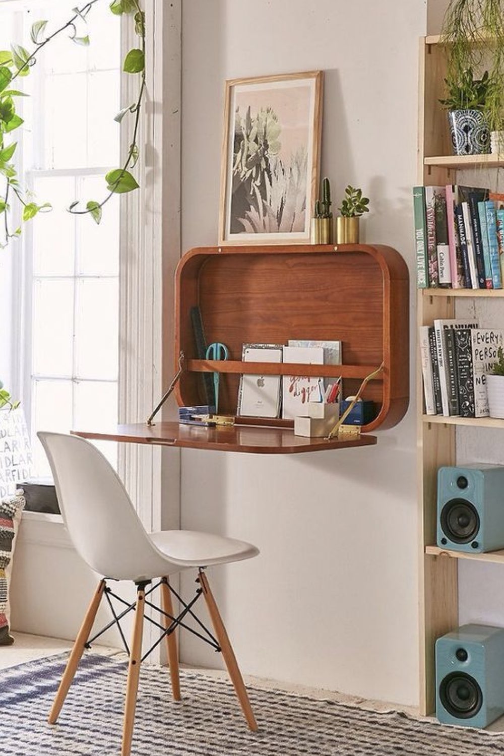 J'aime les petits espaces, j'aime surtout les solutions pour les aménager. Même si le bureau mural convient aussi bien aux petites pièces qu'aux grandes, je vous invite à envisager cette solution si vous avez envie d'un coin bureau chez vous. Dans le salon, dans l'entrée ou encore dans la chambre, son faible encombrement fait qu'il trouve sa place facilement dans une pièce existante.