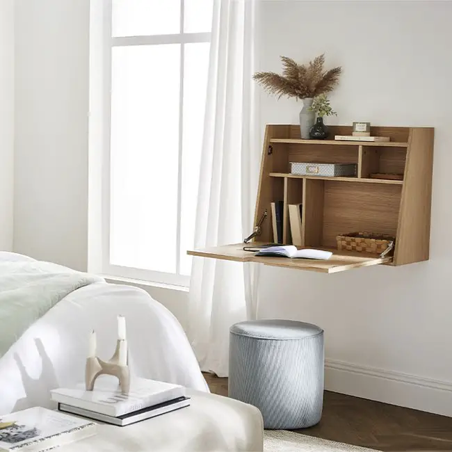 A mes yeux, le gros avantage d'un bureau qui se fixe au mur c'est le gain de place. L'encombrement avec ce type de meuble est moindre qu'avec un bureau classique. Cela le rend donc particulièrement adapté aux petites pièces. C'est aussi une solution à envisager si vous penser installer un bureau dans la chambre ou le salon.