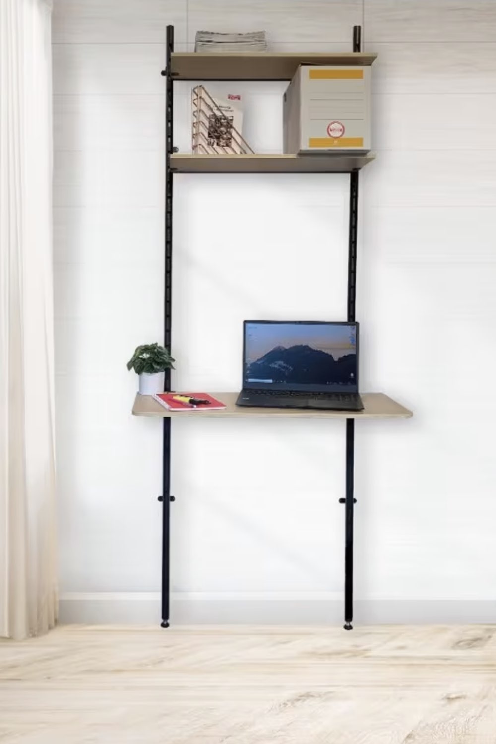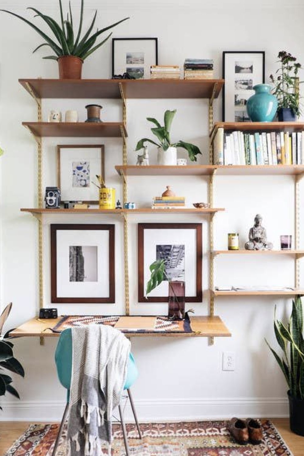 On reste sur l'idée de bricolage. Il est possible de créer vous même votre propre bureau mural grâce à un système d'étagères. Il vous faudra une tablette plus large pour le plan de travail, des étagères classiques au dessus pour poser livres, boites et dossiers. Et surtout, vous aurez besoin d'un système pour accrocher ces étagères au mur. Deux principales solutions s'offrent à vous: