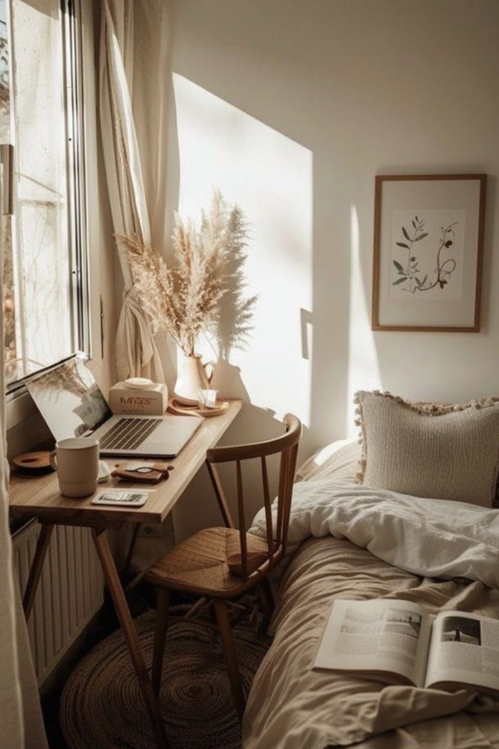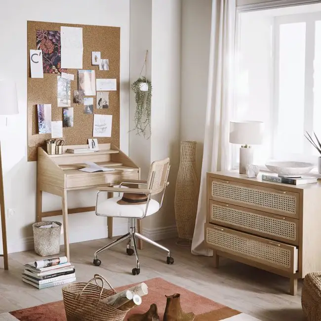 Le style bohème fait des émules depuis plusieurs années. C'est un style dont je parle rarement parce que je ne l'aime pas des masses (je préfère les intérieurs minimalistes). Les décors bohèmes peuvent prendre différentes formes dans le bureau. Tout dépend de votre propre définition du style. Pour certain•e•s, le maximalisme et l'éclectisme priment. Pour d'autres, ce sera l'idée de voyage. Dans tous les cas, cela peut se retranscrire partiellement avec la couleur. On peut imaginer un bureau avec un beige en couleur dominante ponctuée par des touches plus vives.