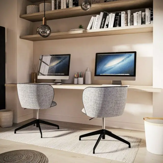Les couleurs neutres peuvent être une solutions pour un bureau partagé. Cela réduit les choix et bien souvent, même deux caractères différents peuvent trouver un terrain d'entente sur un neutre. Si vous avez besoin d'un peu plus de stimulation, d'un environnement plus créatif, rien ne vous empêche de personnaliser votre coin bureau avec des accessoires colorés. Le tout est de ne pas déborder sur l'espace de votre voisin.