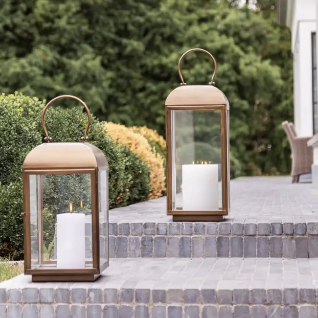- Si vous avez une terrasse / une allée assez classique, une lanterne associant verre et métal peut convenir pour parfaire votre déco extérieure.