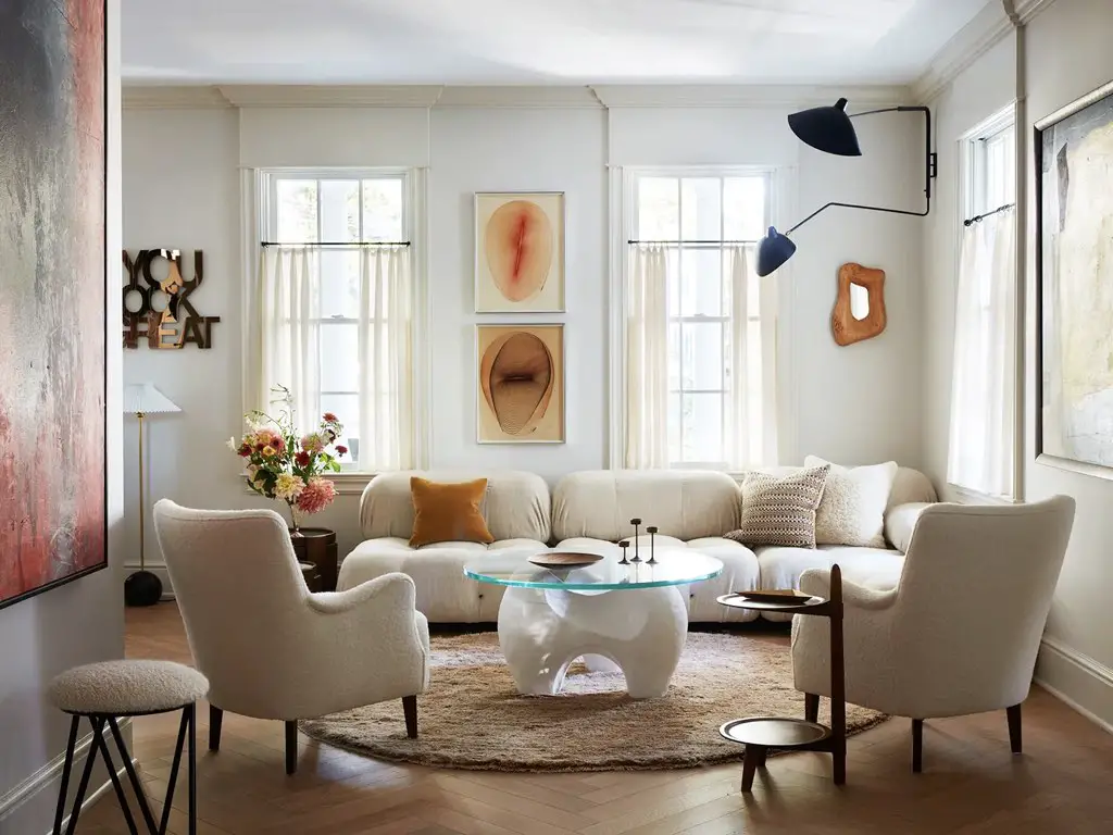 Autre exemple pour donner du style à une pièce blanche: la décoration murale. Dans le coin repas, un paysage est suspendu au dessus de la banquette. Dans le salon, c'est une atmosphère plus moderne avec de la déco murale abstraite dans des tons plus chaleureux. Et je vous parle juste après de la déco murale de la chambre parentale.