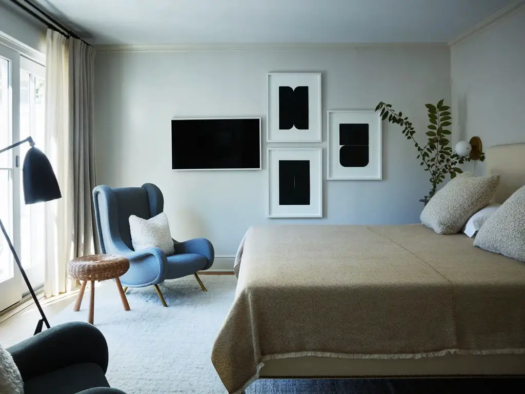La télé dans une chambre, pour certains c'est essentiel. Mais un gros écran noir au milieu d'un mur, on a connu plus déco! Ici la solution est simple et très efficace. L'écran TV fait partie d'un ensemble. Il est accroché au mur avec des tableaux modernes en noir et blanc. La juxtaposition des tableaux et de l'écran fait que ce dernier passe inaperçu. On croit au premier coup d'oeil qu'il fait partie de l'ensemble de la galerie murale.