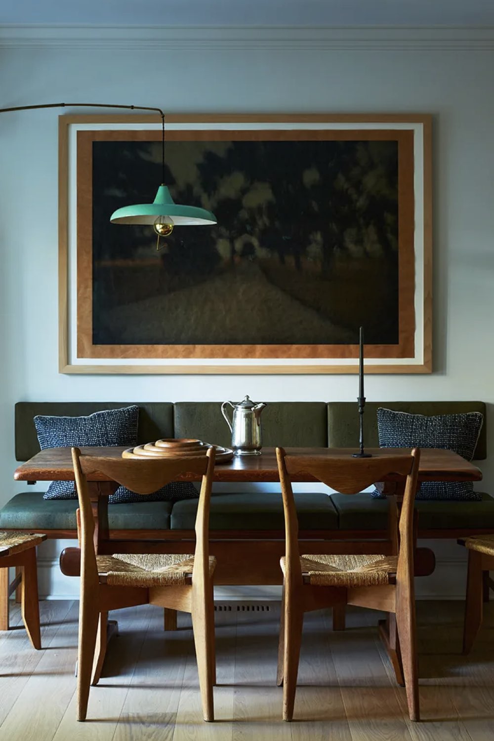 La troisième idée que vous pouvez copier se trouve dans la cuisine. Pour créer un espace où prendre le petit déjeuner, un coin repas a été créé. Cependant pour ne pas empiéter sur l'espace de passage et ne pas perdre de place, une banquette a été posée contre le mur. Une banquette permet d'économiser l'espace nécessaire pour reculer une chaise. Par ailleurs, la banquette de cette maison est un coup de coeur pour moi. J'aime beaucoup son allure vintage.