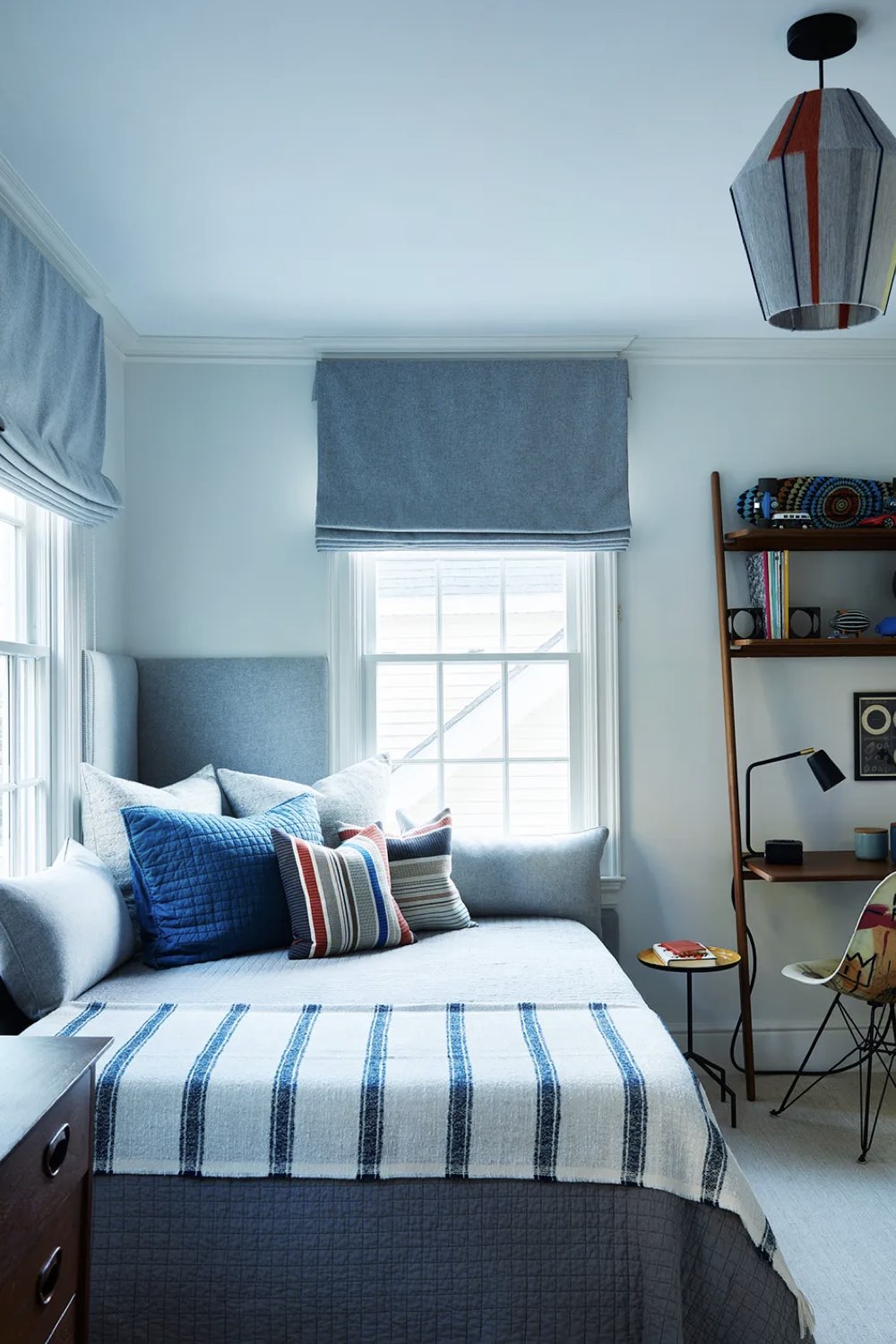 On reste dans les espaces privées de la maison avec la chambre d'enfant. Les parents ont choisi un lit coffre qui permet d'avoir plus de rangement sans pour autant encombrer l'espace. C'est une solution très pratique et discrète. Ici, le coffre sert à ranger une planche de surf. Dans votre chambre ou dans celle de votre enfant, cette solution peut vous permettre de ranger les vêtements qui ne sont pas de saison ou encore le linge de lit.