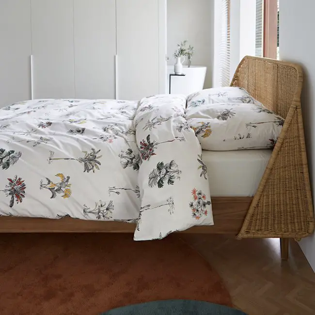 Toujours dans une veine nature (vous savez que c'est un style déco que j'affectionne particulièrement), la housse de couette Mirella s'invite facilement dans votre chambre à coucher avec ses motifs imprimés palmiers sur fond blanc.