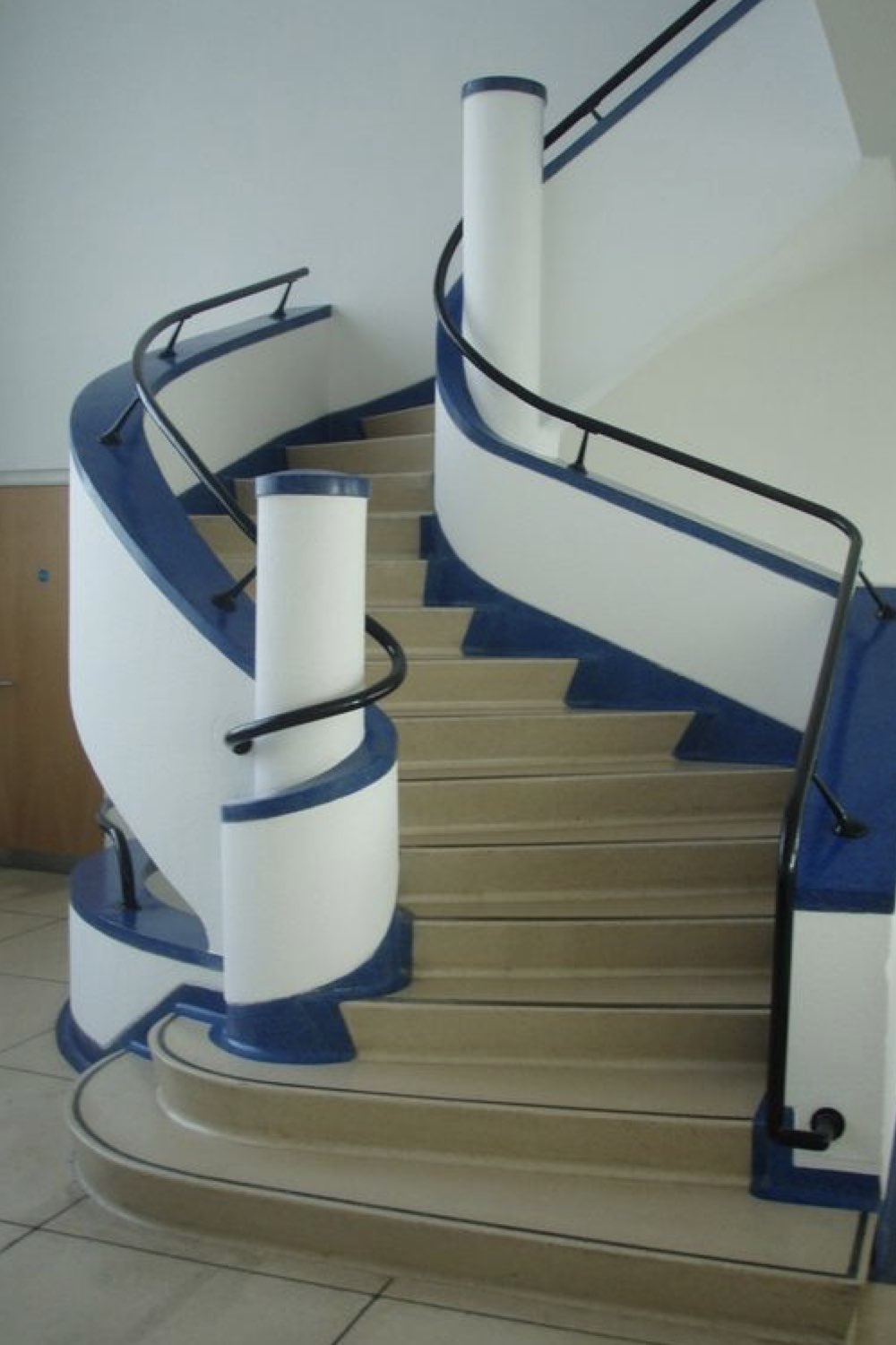 - terrasses et balcons à bastingages en porte-à-faux (comme les coursives d'un bateau), toit-terrasse, passerelle;