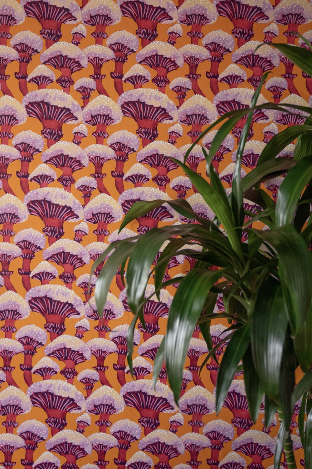 Je l'ai évoqué dans la partie précédente: dans la cuisine, c'est un papier peint zébré en noir et blanc. Dans le bureau ce sont des champignons hyper colorés. Dans la chambre, un pan de mur entre deux fenêtres et au niveau de la tête de lit représente des fleurs et des dragons. Je pense qu'on peut être d'accord sur le fait que le papier peint fleuri c'est commun, l'esprit médiéval des dragon, ça l'est moins!