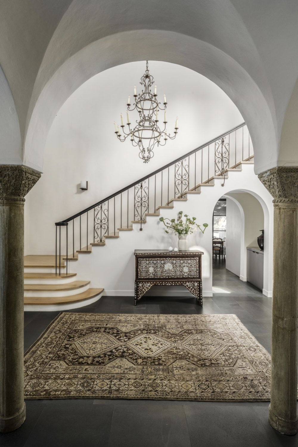 - des colonnes en pierre et éléments en fer forgé dans l'entrée