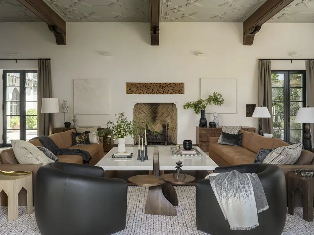 L'architecte d'intérieur Maria Khouri a du adapter la taille du salon à la taille de la demeure. C'est un espace hors norme qu'il fallait rendre chaleureux. On trouve du bois, des matériaux nobles et naturels (cuir, lin). Le choix de matériaux et couleurs a été fait dans une palette moderne et épurée pour créer un contraste avec l'architecture de la pièce. Et pour occuper l'espace, c'est un jeu de symétrie qui a été privilégié avec les canapés et tables basses qui sont en miroir de chaque côté d'un axe invisible créé par la cheminée.