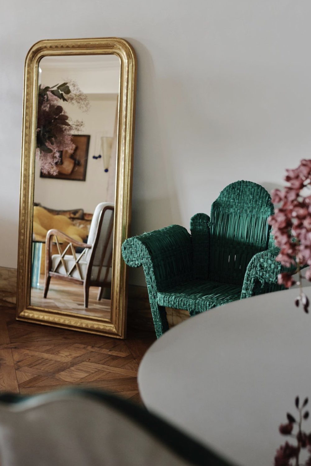 Outre le choix des matériaux, dans cet intérieur, on peut noter l'éclectisme du mobilier. La propriétaire est la fille d'un marchand de meubles anciens et on sent toute sa sensibilité quant aux choix des meubles qui composent son logement. Banquette et canapé en velours avec des franges, piano de cuisson dans la cuisine, lustres, vestiaire en fer forgé... Un mélange de styles et d'époques qui crée un univers personnel avec beaucoup d'histoire.