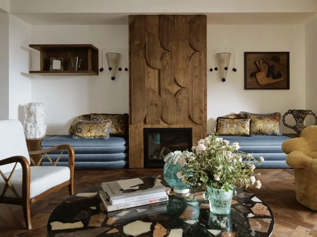 Mais ce qui me plait le plus dans cet appartement australien est le mur contre lequel se trouve la cheminée. D'abord, l'habillage de cette cheminée. Un habillage en bois sculpté qui nous envoie dans les années 50. Un choix unique qui crée un point focal intéressant, qui happe le regard. Ensuite, les banquettes, dans le même esprit mid century dans un bleu velouté et élégant. J'y vois une douce invitation à lire un bon livre le week-end.