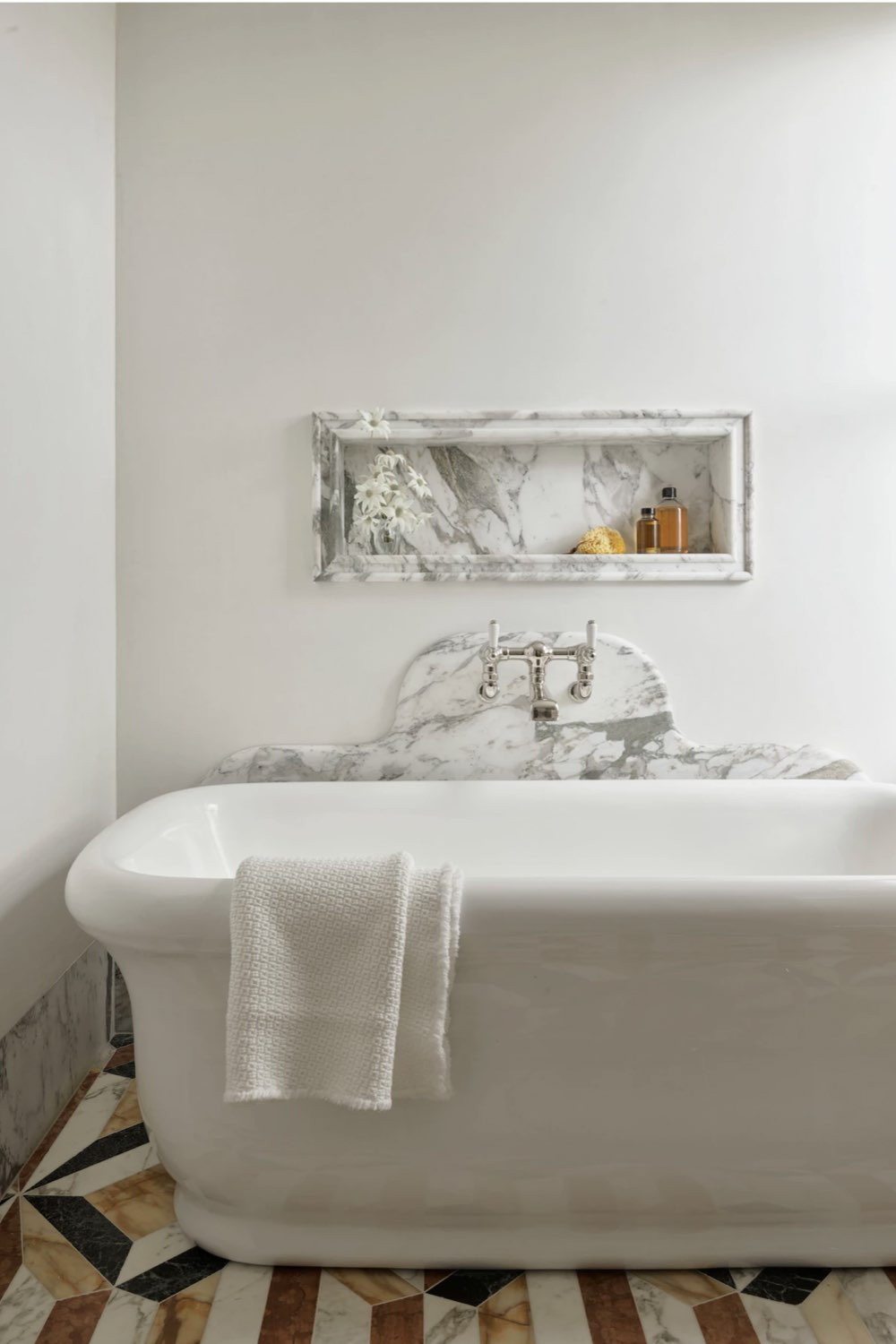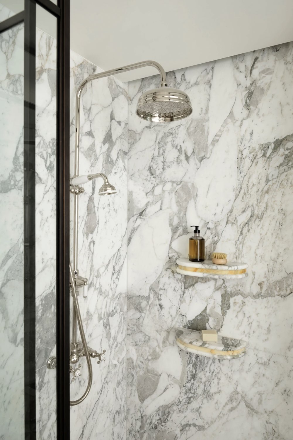 Commençons par évoquer l'élégance et intemporalité de l'appartement. Les revêtements y sont pour beaucoup. Et dans la plupart des espaces, on trouve du marbre. Crédence de cuisine, plan de travail, plans vasques, revêtement de douche ou encore revêtement de sol. Un marbre blanc avec des veine plus foncées qui apportent de la vie. Les revêtements de sol des salles de bains sont particulièrement intéressants. Pas de grandes plaques de marbres mais un mélange de matériaux avec des formats qui sortent sans conteste de l'ordinaire. Si on ne trouve pas de marbre, on trouve du bois, lui aussi très élégant, lui aussi dans un format de parquet qui sort de l'ordinaire.