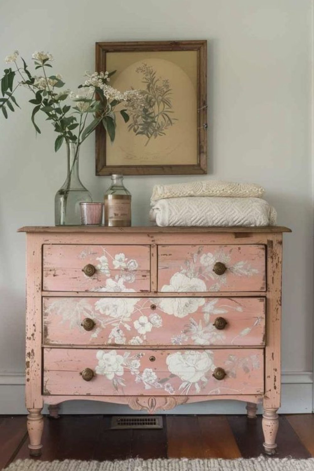 Dans la même veine que le point précédent, pour créer un décor Shabby Chic dans la chambre ou dans le salon, il est possible de relooker un meuble ancien que vous avez déjà. Un peu de peinture suffit bien souvent pour intégrer votre meuble dans votre décor. Il est possible aussi d'utiliser la technique du pochoir pour peindre un motif floral sur votre meuble (je vous avais dit que les motifs floraux étaient importants ici).
