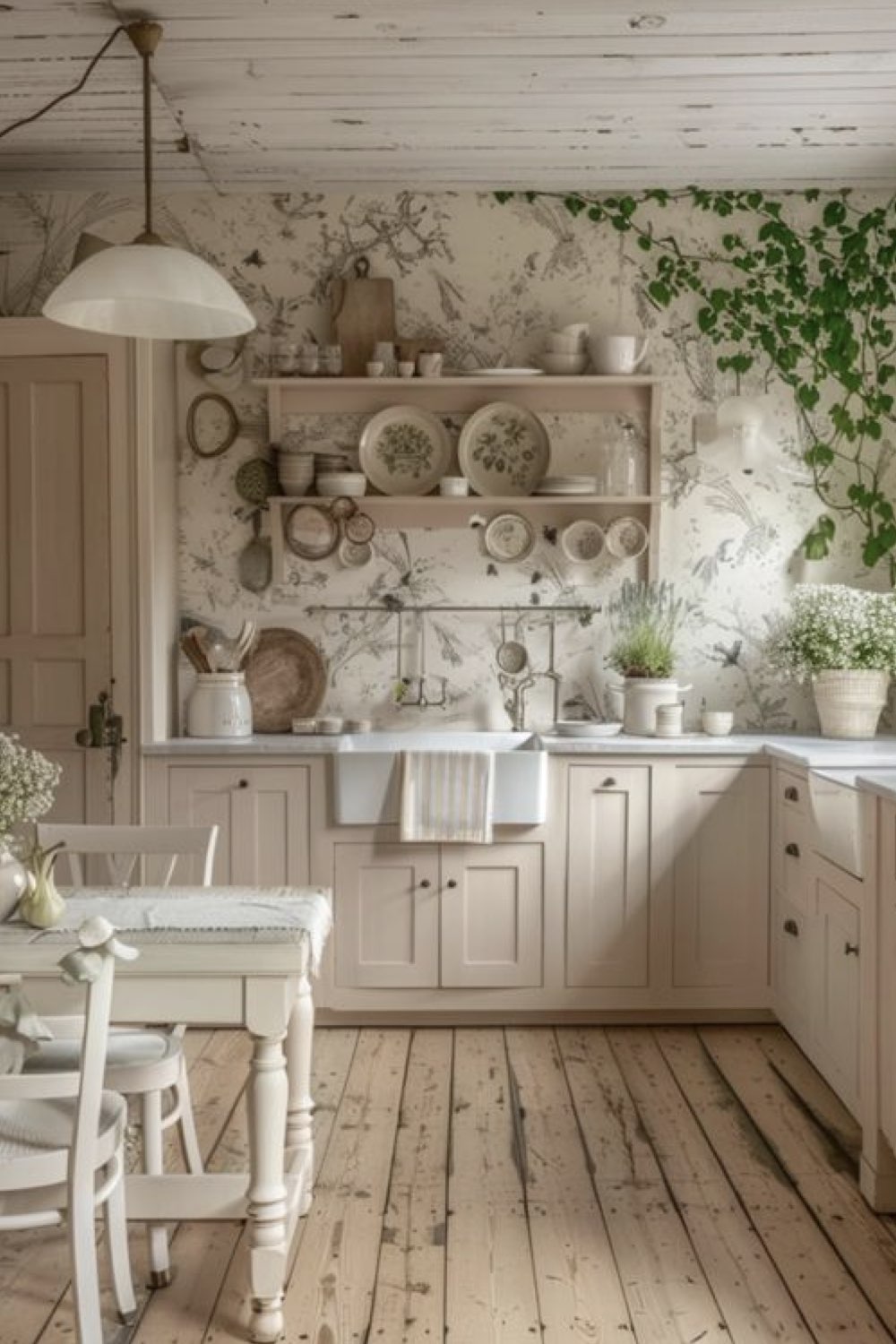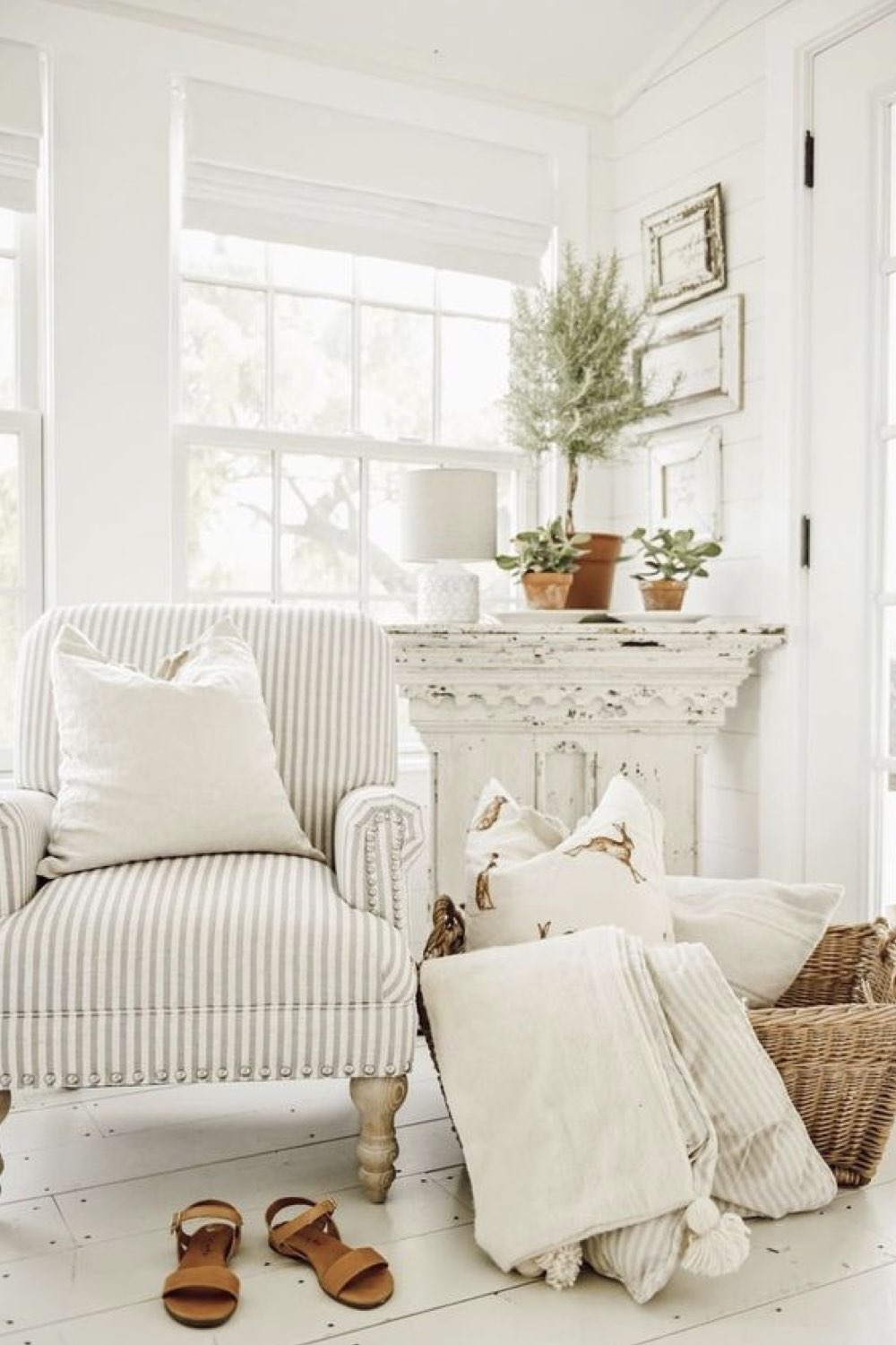 Le blanc a sa place dans ce type de déco cependant, c'est souvent un blanc texturé. Qu'est-ce que j'entends par texturé? Il ne va pas être lisse sur un mur de placo, cela lui confèrerait un air un peu trop moderne. Au lieu de cela, le blanc a se patiné, il va aussi se retrouver sur du lambris par exemple. L'écru qui est un blanc pas tout à fait blanc est une possibilité également. Il est un peu plus chaleureux que le blanc classique.