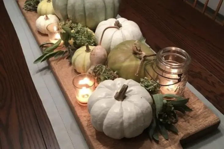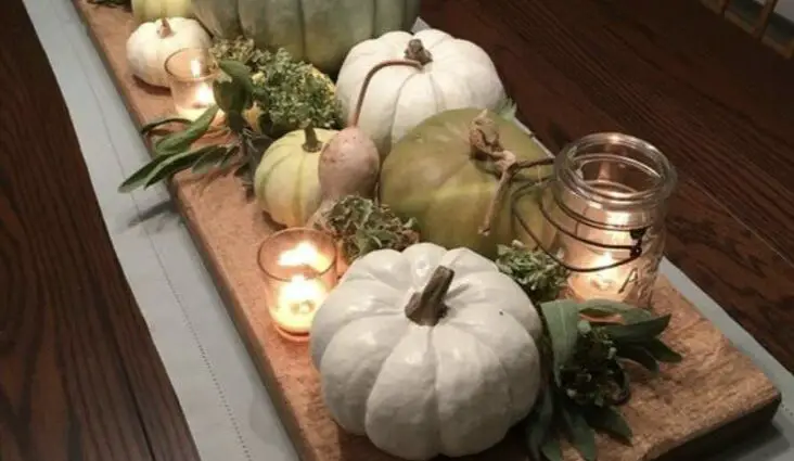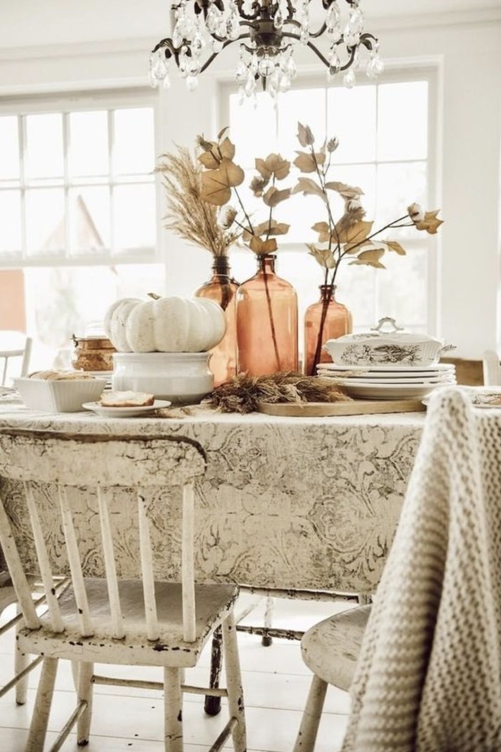 La vaisselle peut être un élément du centre de table (la soupière par exemple qui ne sert pas tous les 4 matins). On peut également pensé à des flacons anciens de différentes tailles en guise de vase. A tout cela on ajoute une citrouille (ou autre cucurbitacées), des feuillages et des épis de blé et le tour est joué!