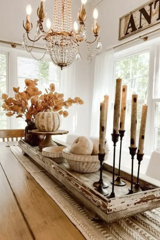 Ici, le rustique prend forme grâce aux couleurs neutres, la patine du plateau, les paniers et les fruits blanchis. L'harmonie de couleurs rend le centre de table élégant et discret bien qu'ils soit assez long. La discrétion passe également par la disposition des différents éléments. Contrairement au premier exemple, la composition n'est pas du tout compacte. Les éléments sont espacés. Il y également une symétrie de part et d'autres du plateau et au centre, les éléments plus bas offrent à l'ensemble un rendu plus léger.