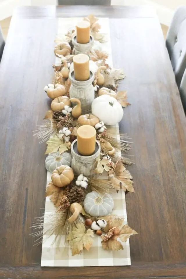Le plateau n'est pas la seule base possible pour créer un joli centre de table saisonnier. L'une des alternatives est de prendre un fin chemin de table qui va vous aider tel une trame. Le résultat visuel est moins condensé et plus bas qu'avec un plateau. Le tissu à carreaux contribue à l'idée de décor rustique.