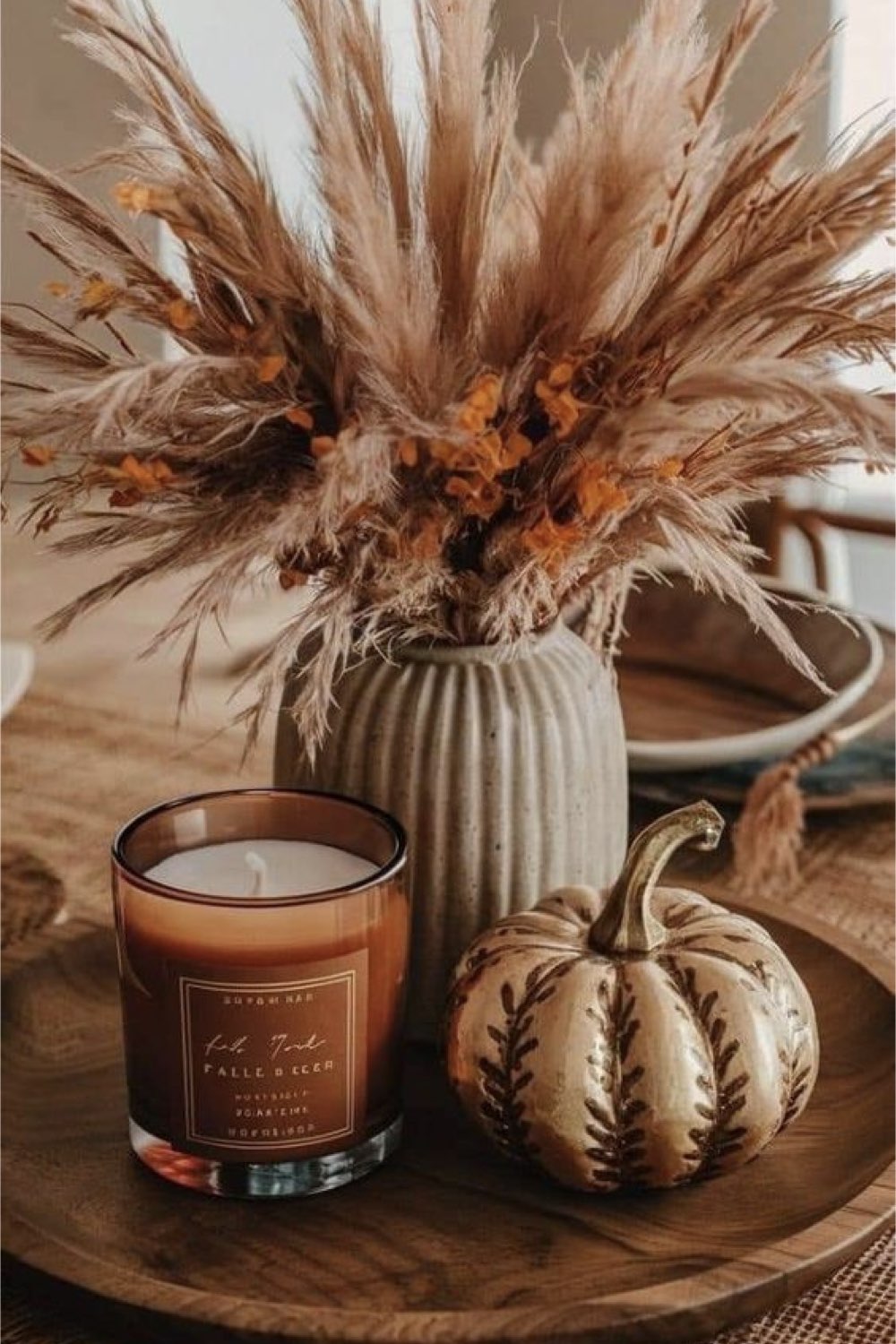 Il est composé d'un plateau en bois, d'une bougie dans un verre en verre fumé, d'un objet décoratif qui reprend la forme d'une citrouille, d'un vase beige et d'herbe de pampa. Si vous avez tous ces éléments chez vous, la mise en oeuvre de ce centre de table devrait vous prendre au grand maximum 10 minutes. C'est un centre de table qui colle aussi bien pour la table de cuisine, celle de la salle à manger au quotidien, comme une table plus décorée pour recevoir des proches et amis.