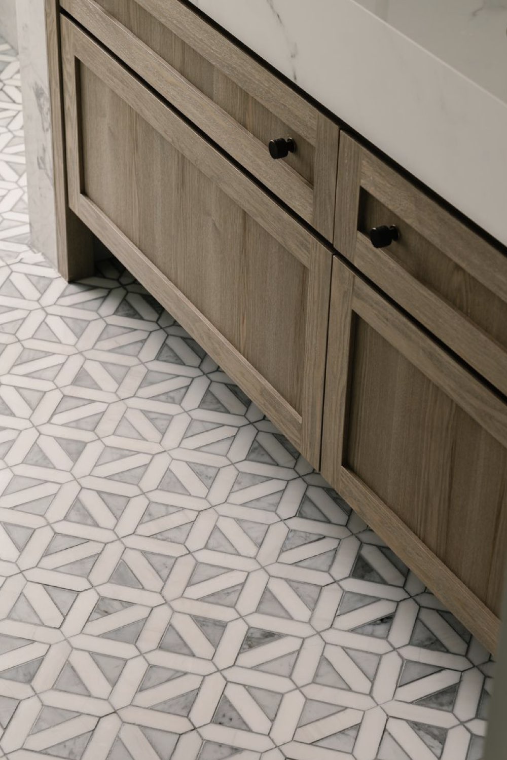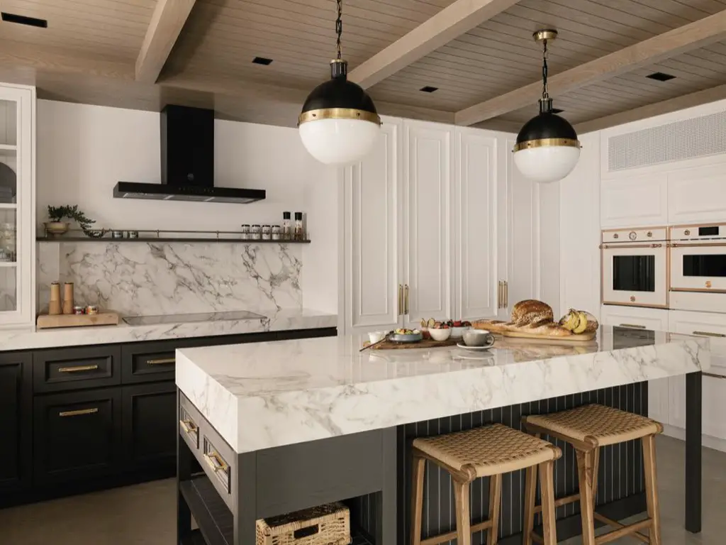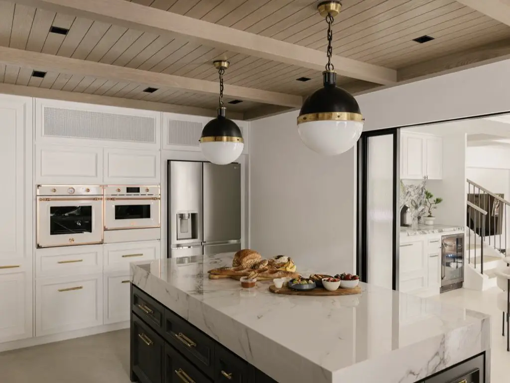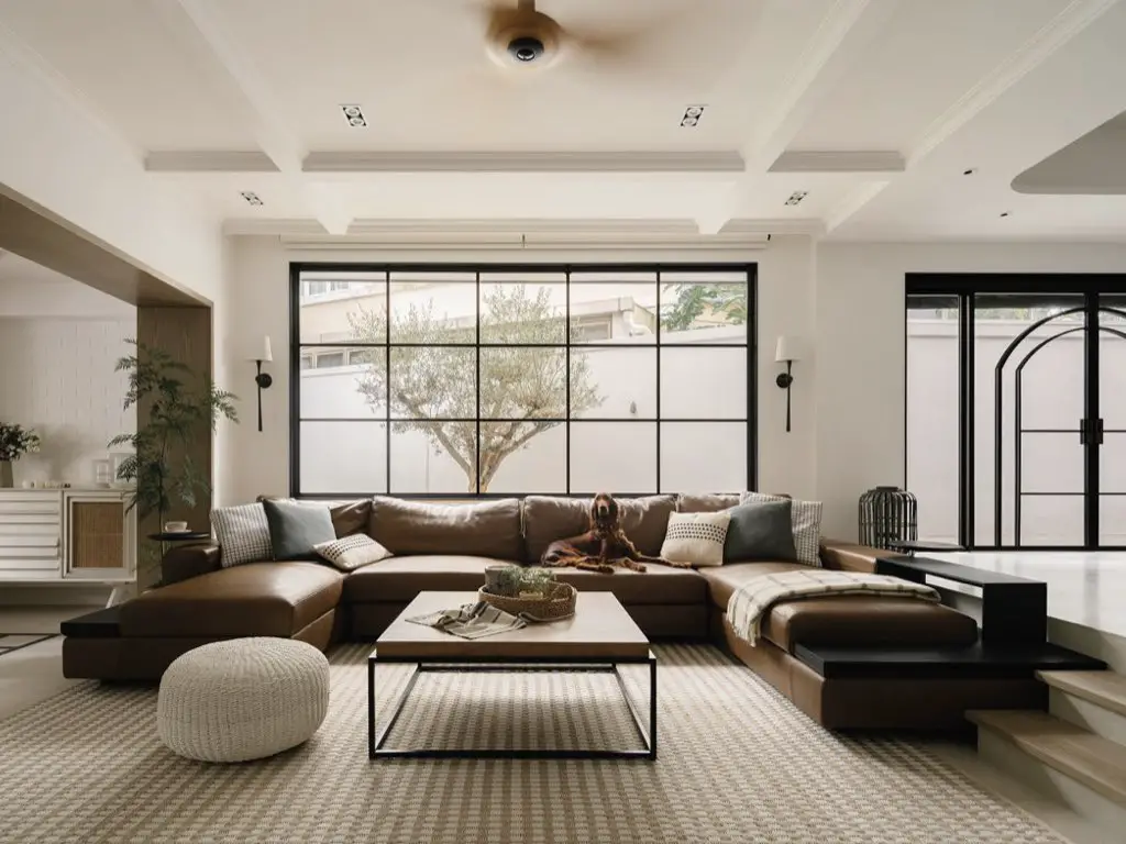 J'ai déjà évoqué une partie des matériaux précédemment. Cependant pour compléter notre house tour, on peut également noter la présence du cuir notamment à travers le canapé en U qui meuble une grande partie du salon. En plus du cuir, on retrouve le marbre particulièrement dans la cuisine et les salles de bain. Un marbre clair qui contribue a créé une atmosphère naturellement lumineuse.