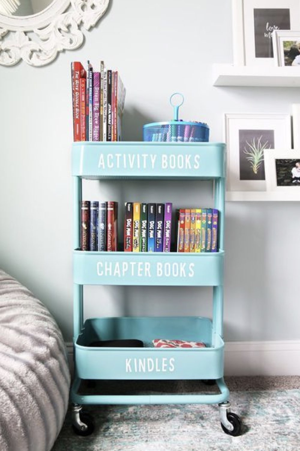 Manuels scolaires, livres en cours de lecture... Ce sont des livres qu'on ne peut pas ranger tout en haut de la bibliothèque parce qu'on en a besoin au quotidien. Il faut donc trouver une solution pour les ranger tout en les gardant à portée de main. Et pourquoi ne pas opter pour une petite desserte? Ca ne prend pas beaucoup de place. Elle peut se déplacer facilement (pratique pour faire le ménage). Et si vous avez une Cricut par exemple, vous pouvez la personnaliser. Cette solution est parfaite aussi pour ranger les affaires d'école de votre enfant également.