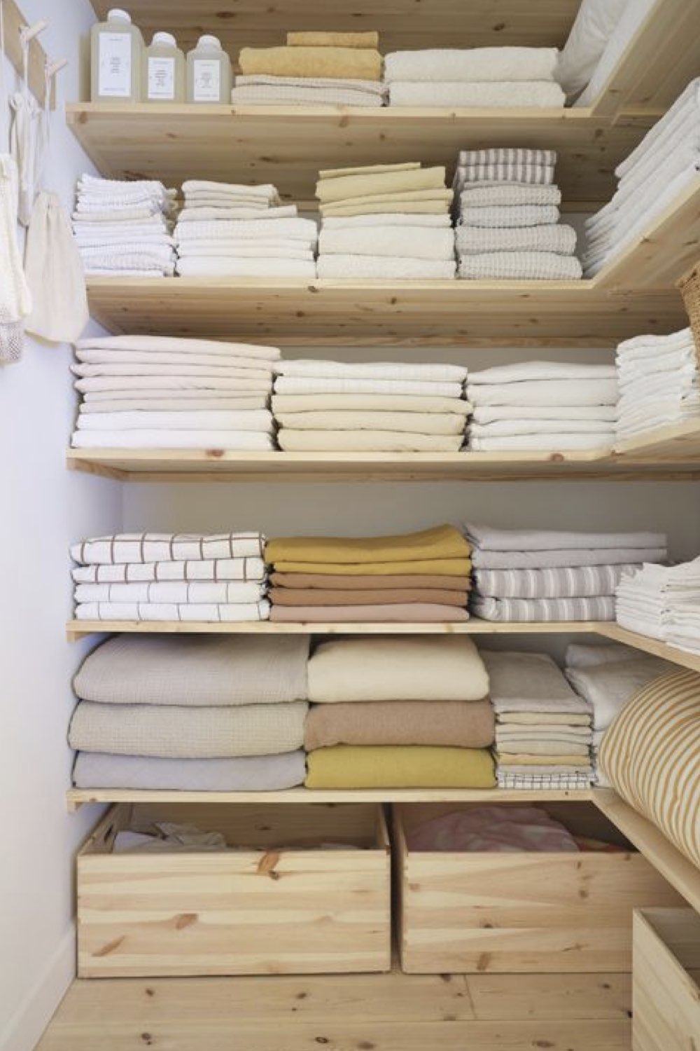Dans l'exemple sélectionné, je garde deux idées principales: la première se sont des caisses de bois en bas en dessous des étagères pour ranger les petites choses qui ne se plient pas. La seconde c'est l'idée de grouper les différents textiles par tailles. Les draps avec les draps, les serviettes de tables avec éventuellement les torchons, etc. Par ailleurs, les piles ne sont pas très hautes ce qui les rend plus stables.